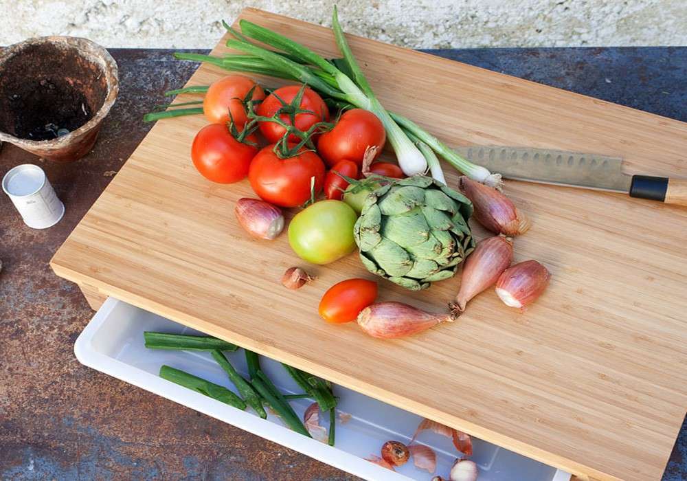 Hámozza meg a gyümölcsöt és zöldséget, vágja fel a kenyeret vagy vágja fel a baromfit a tömör bambusz fa deszkán, amely tökéletes 43 x 29 cm-es munkafelületet kínál. Egyszerűen betolja az összes hulladékot és zsemlemorzsát a gyűjtőtálcába, és már nincs útban.