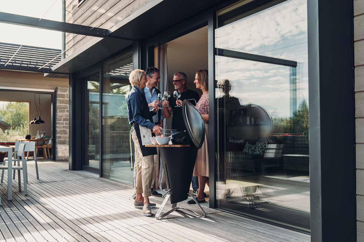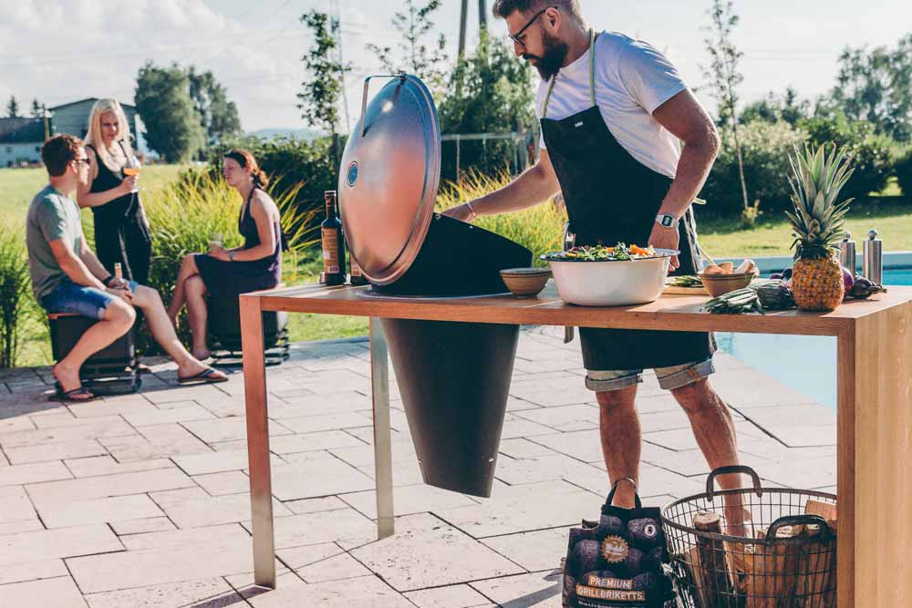 Formatervezett Höfats Cone faszenes grill, amely pultba építhető kivitelben vagy saját lábakon álló / szabadon álló kivitelben is megrendelhető.