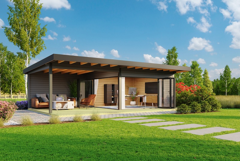 - Kész faház építés, home office vagy kerti konyha építés előregyártott faház anyagból, hatalmas terasztetővel. Igazi ékszer ez a sokoldalúan berendezhető faház a kertben.