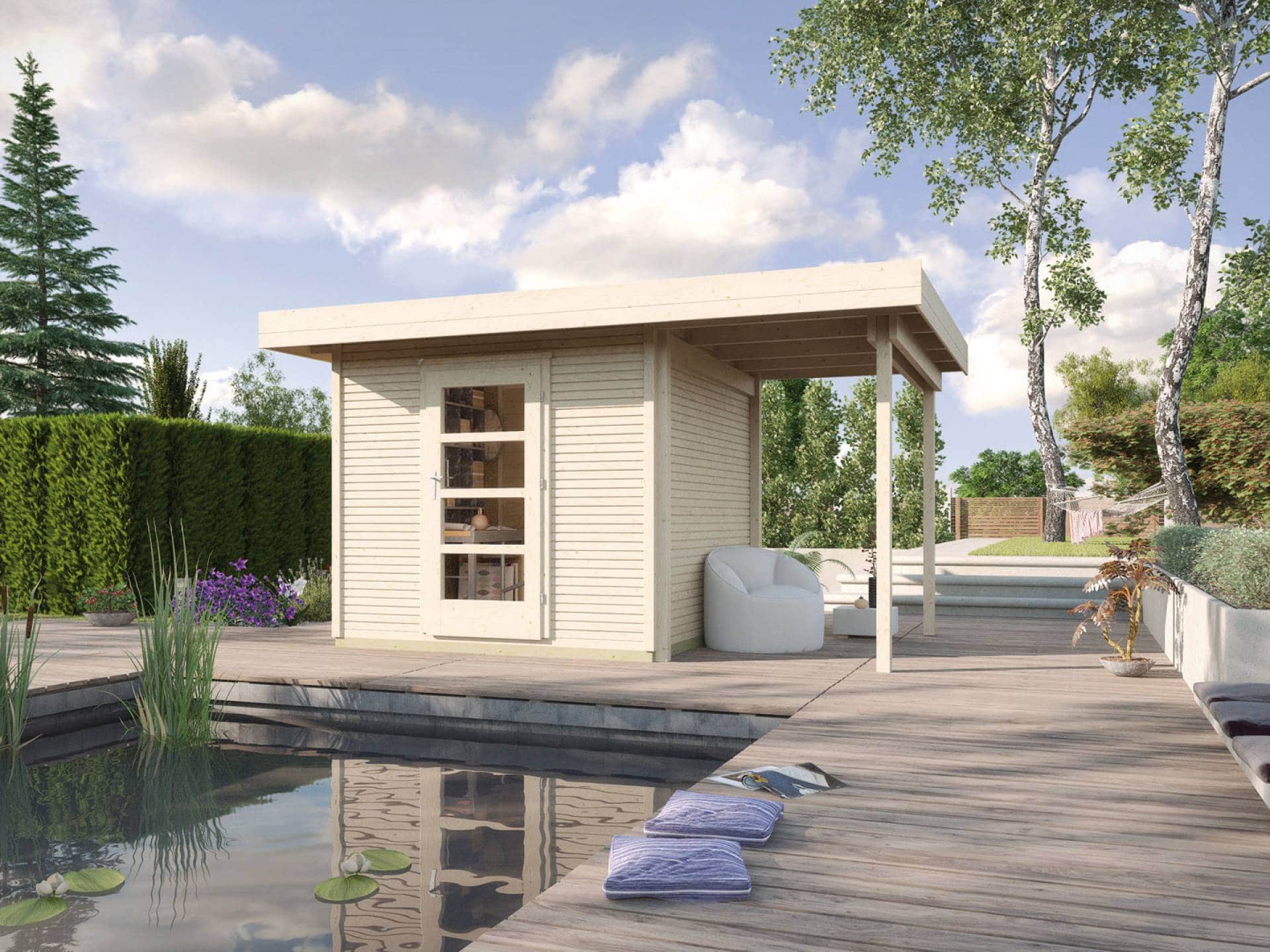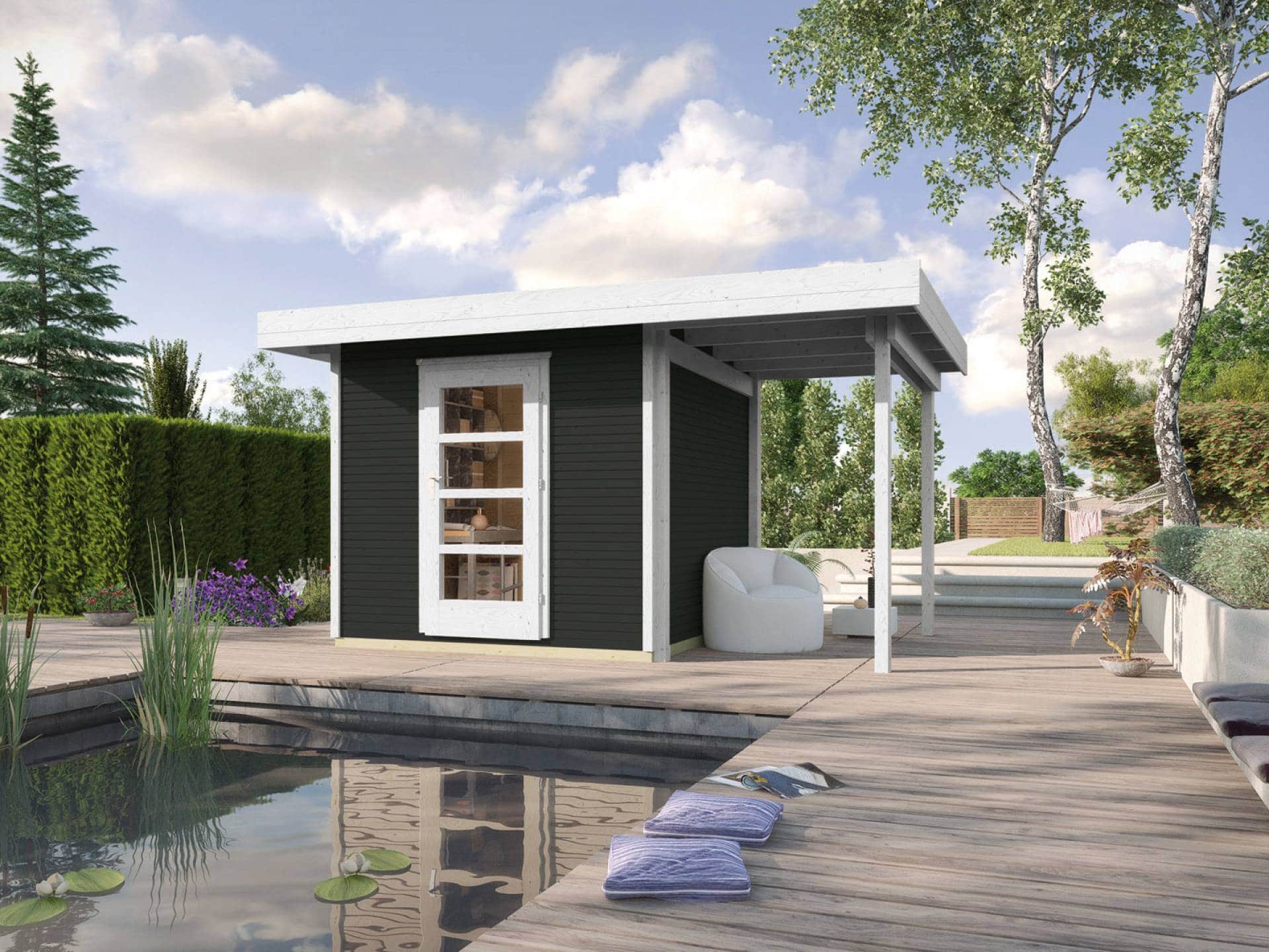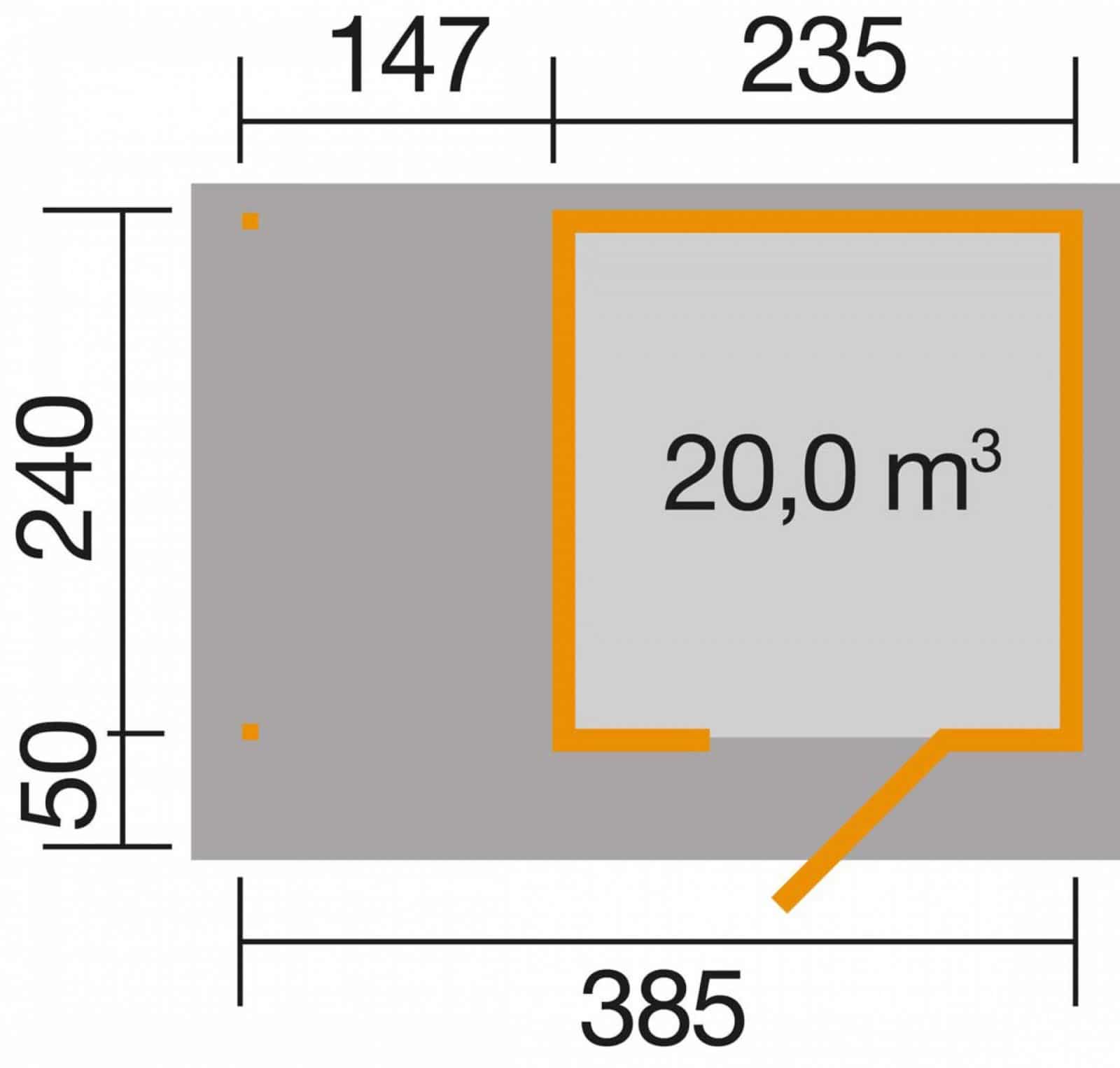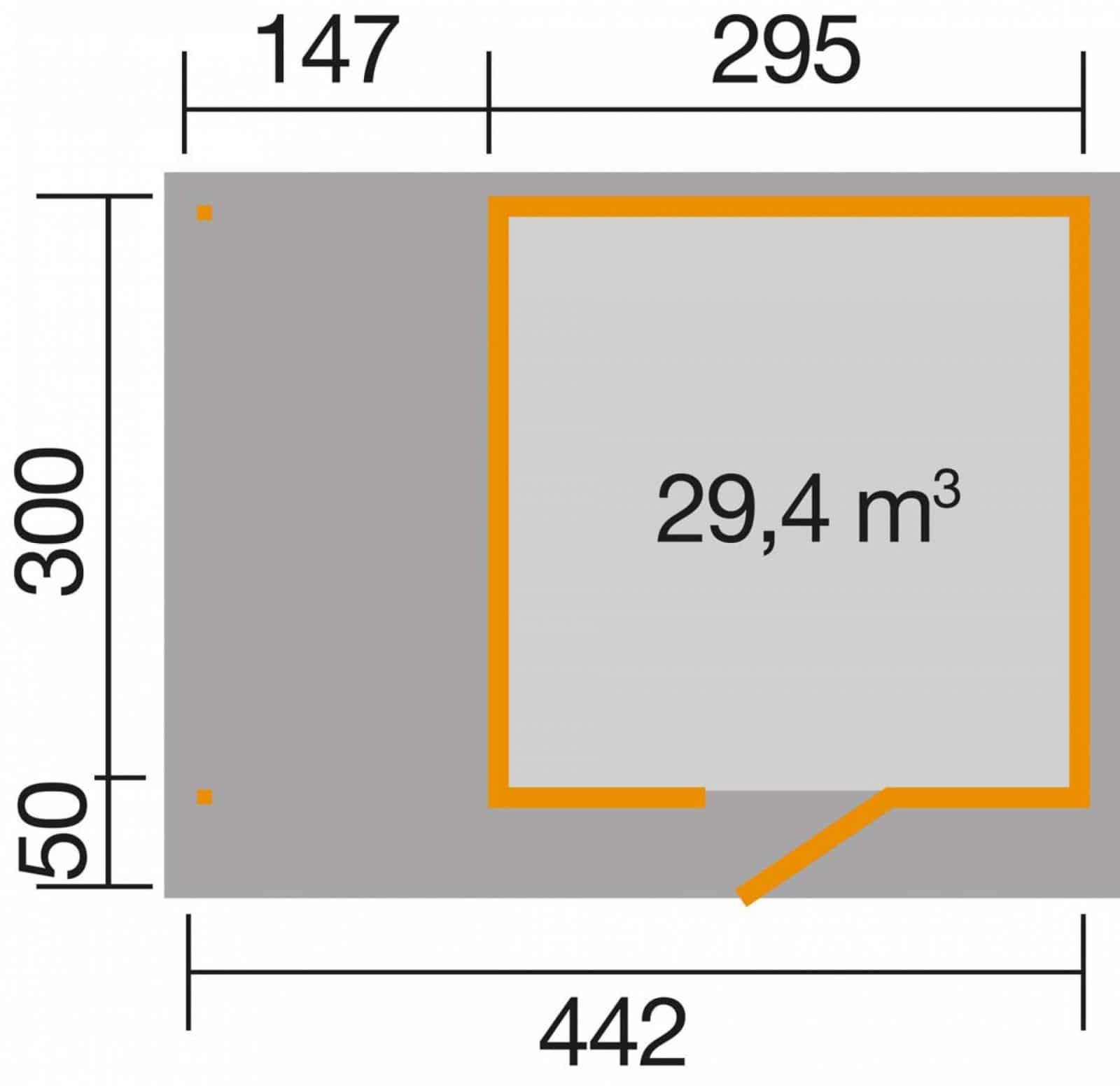 Ez a faház  2 méretben  235 x 241 cm  vagy  295 x 300 cm alapozási méretben és 2 féle színben rendelhető + 147 cm-es oldalsó fatárolóval, hátfal nélkül.