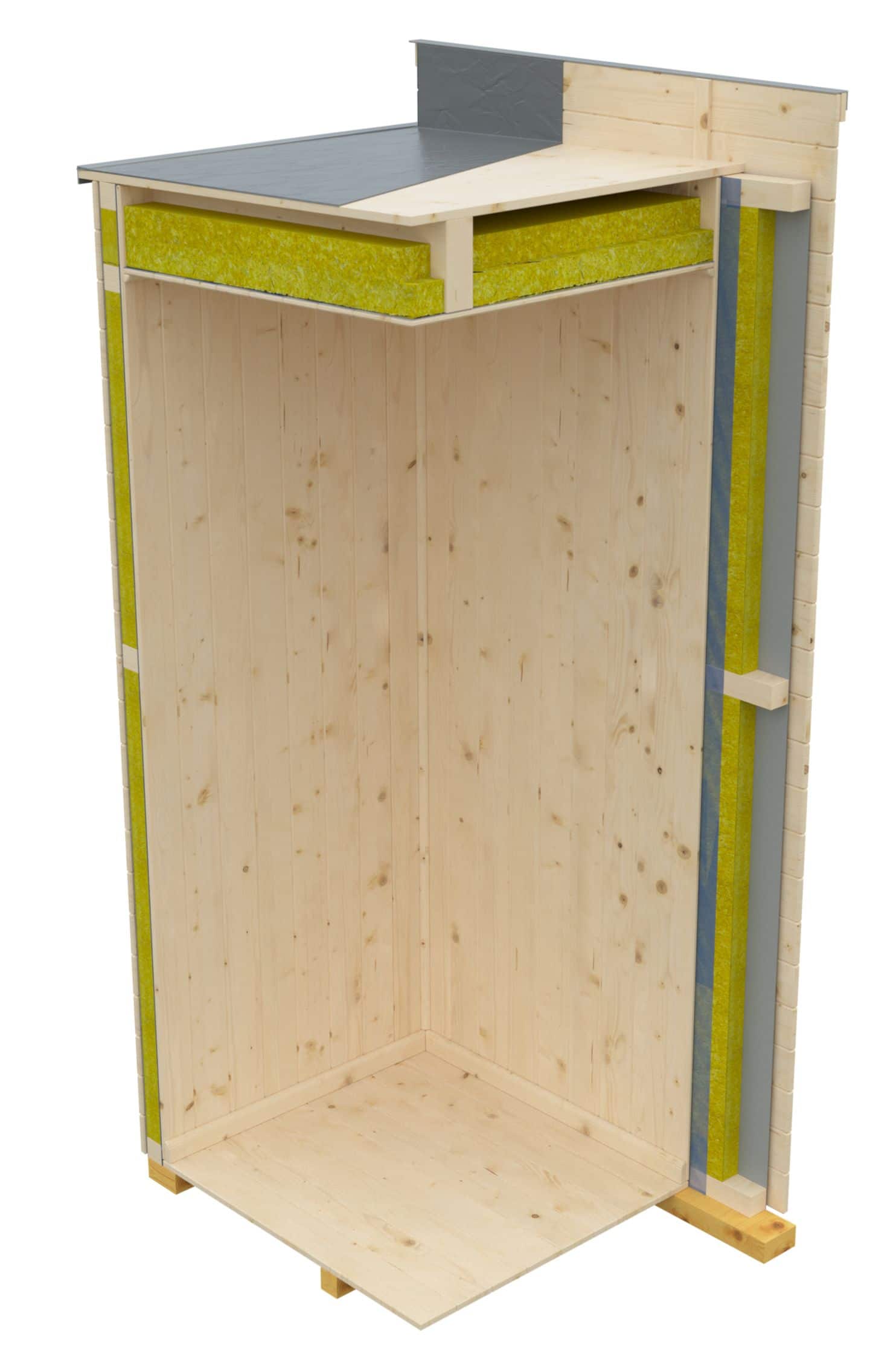 - A szigetelt változat oldalfal szigetelésének rétegrendje: belső 14 mm lambéria borítás + párazáró fólia + 60 mm ásványgyapot szigetelés + 19 mm lambéria borítás, mint külső falszerkezet.