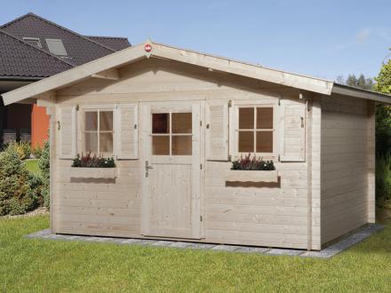 Faház oldalfalai boronavázas illesztéssel kapcsolódnak, 28 mm vastag tömörfa elemekből épül a kerti tároló. Alap esetben kezeletlen natúr színben kerül kiszállításra a lapra szerelt faanyag !