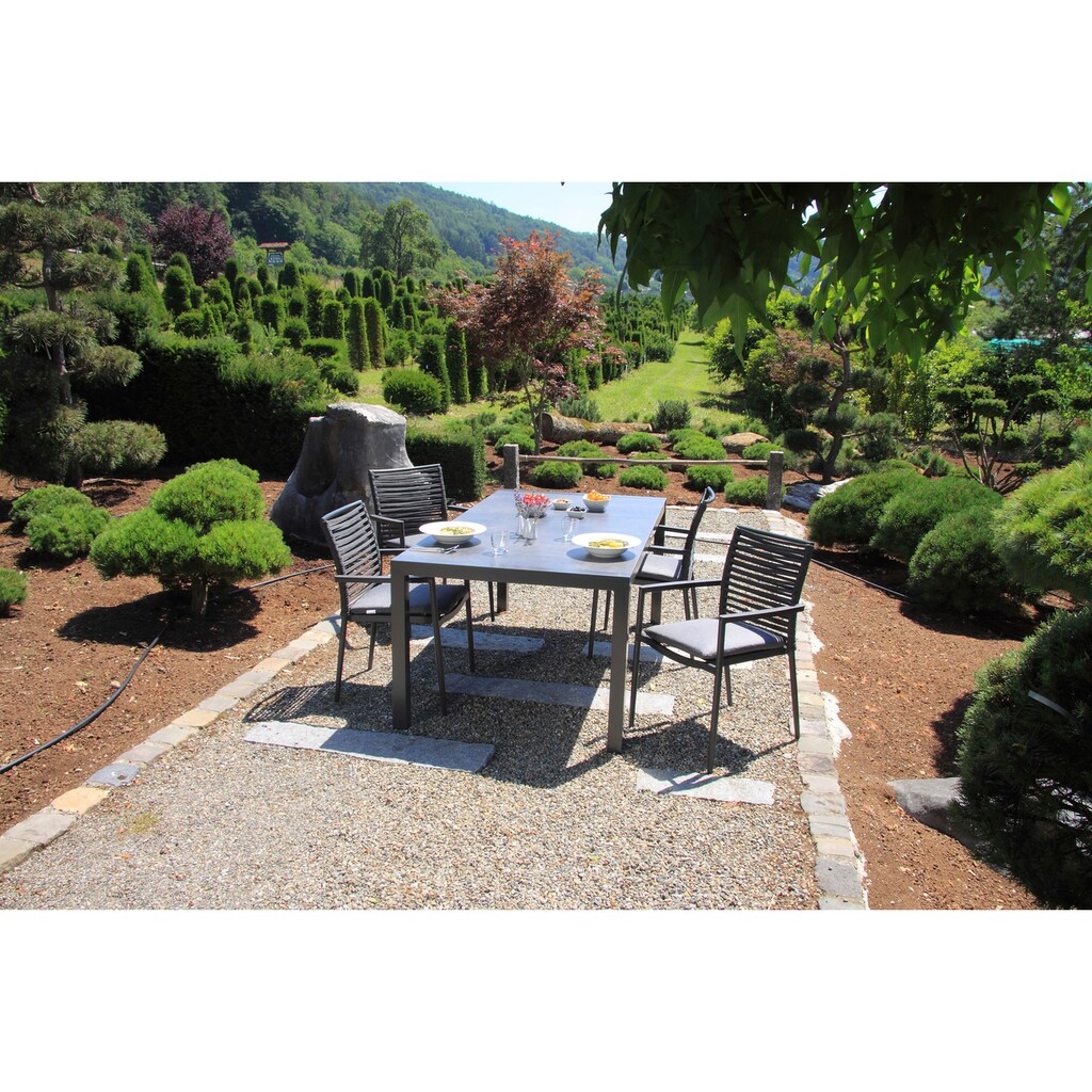 - Kerti asztal 98 x 180 cm; időjárásálló 12mm vastag HPL kültéri asztallappal + 4 db rakásolható Bergen kerti szék párnákkal együtt