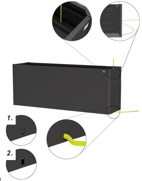 - Előkészítés az öntözőrendszerhez: Öntözőcső átvezetés a keskeny oldalon (Méret: 17 x 17 mm).