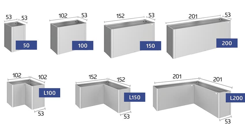 Minőségi Biohort rozsdamentes virágágyás 53 x 53 cm-es, 102 x 53 cm-es, 152 x 53 cm vagy 152*152 cm és 201 x 53 cm méretben, 3 különböző magasságban 44 cm vagy 61 cm és 77 cm. Kérjük a fenti – kép melletti – választó gombok segítségével jelölje meg a kívánt méretet és színt.