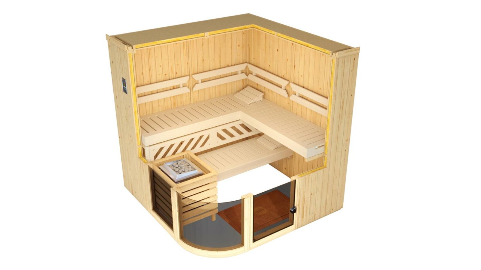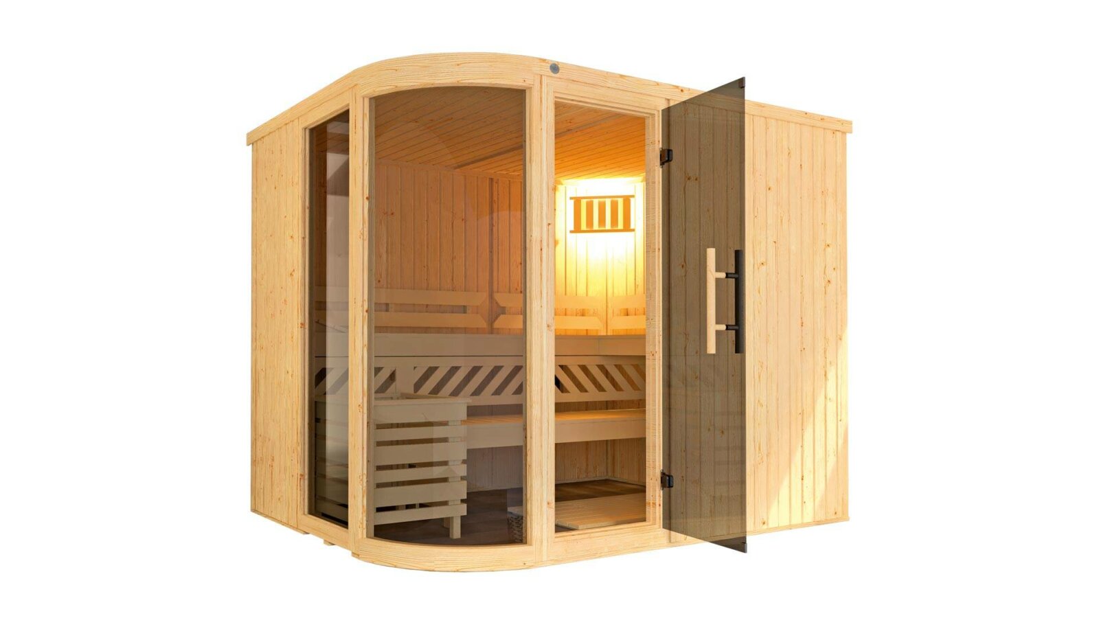 Design finn szauna íves ablakelemmel 244 x 194 cm vagy 194×194 cm méretben Szaunakályhával vezérlővel együtt.