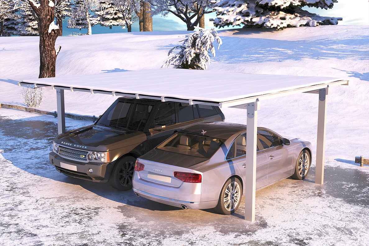 - Innovatív, modern fém nyitott garázs. Alumínium Carport 2 autó részére polikarbonát (4-falú; 10 mm) tetőfedéssel, 2 választható színben