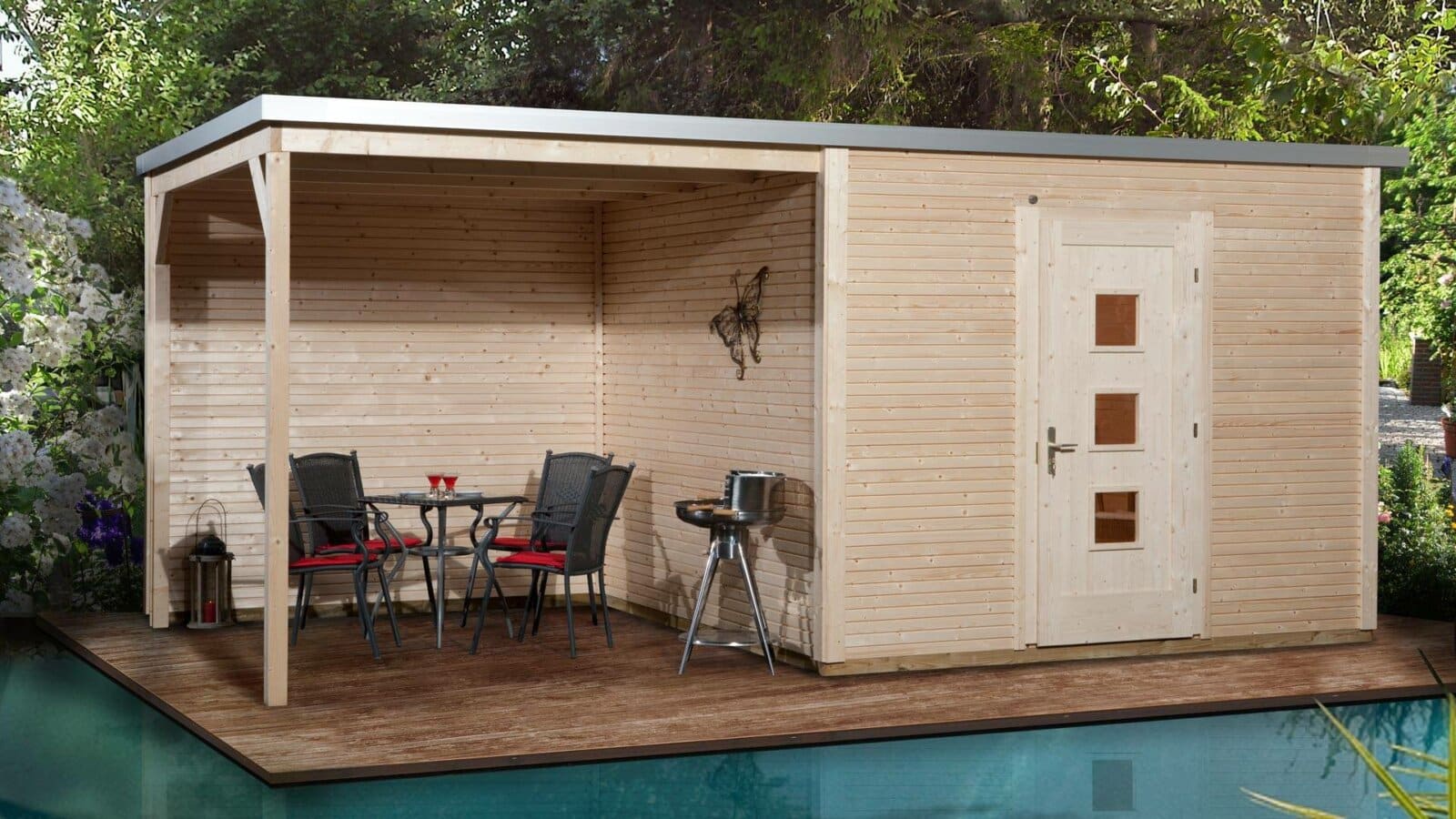 - Masszív 45 mm vastag tömörfa gerenda kerti ház oldaltetővel.