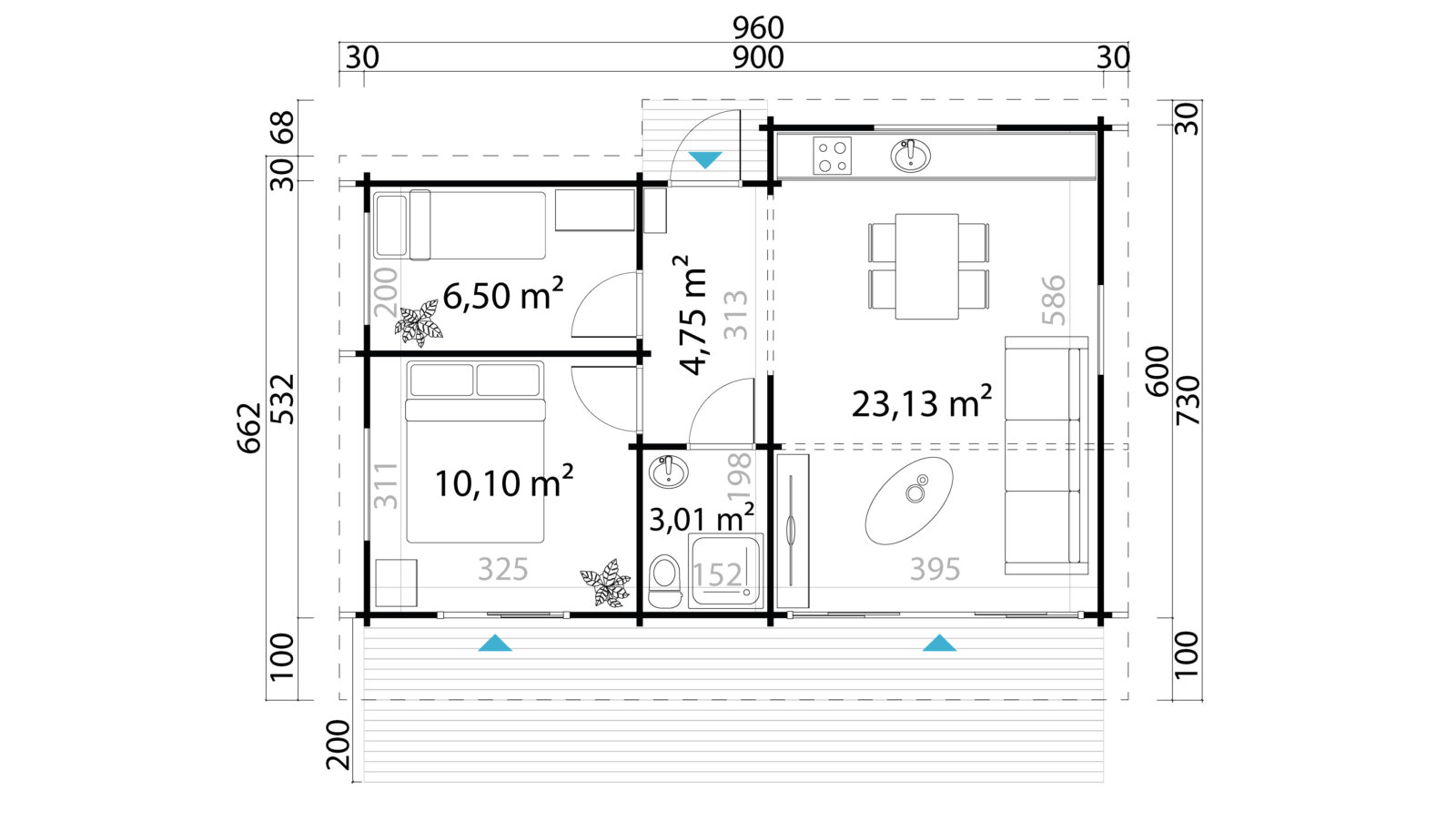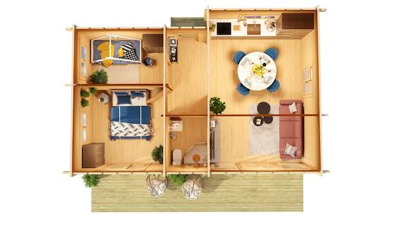 Hétvégi faház 900 x 600 cm; + 200 x 900 cm fa burkolatú terasszal; nettó belső lakó felület 50,7 m2