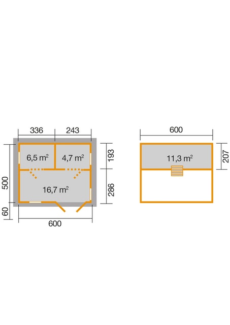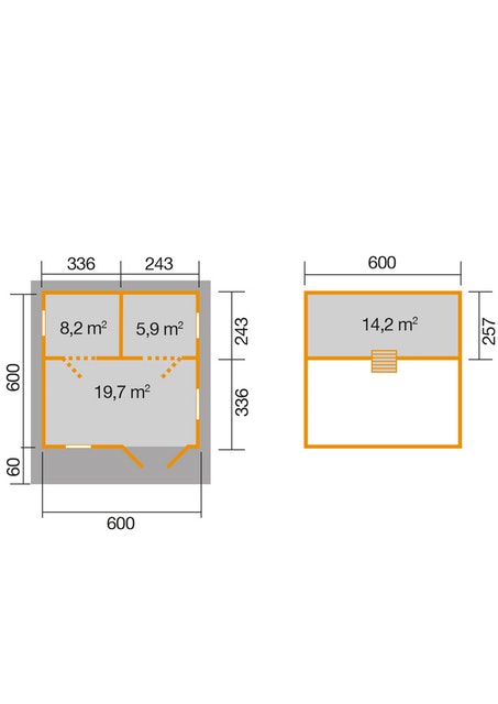 Weka 703-as gerendaházunk 70 mm vastag masszív, tömör északi fenyő gerenda oldalfalakból épül 3-választható méretben: 600 x 500 cm vagy 600 x 600 cm vagy 700 x 700 cm-es alapozási méretben. ( bruttó külső sarokméret = alapozási méret )
