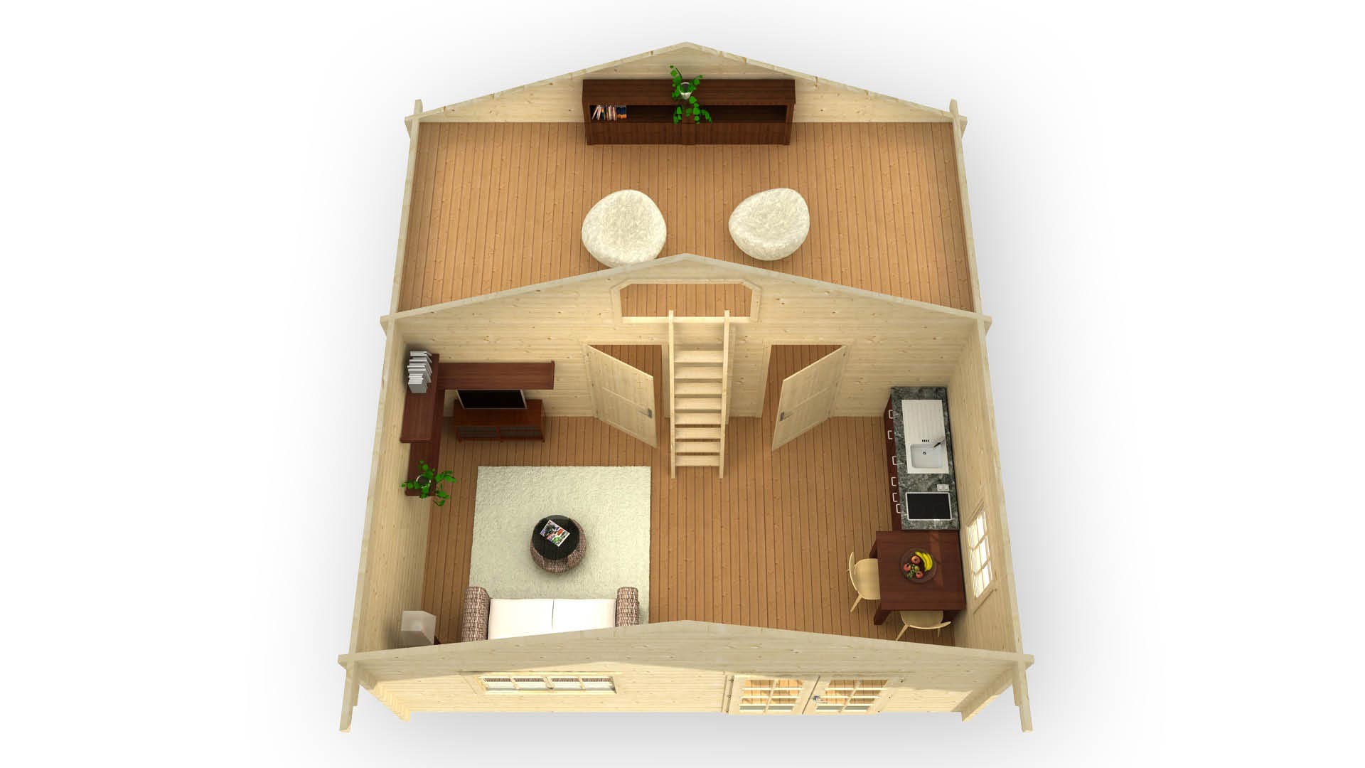 Ez a 703-as hétvégi faház tágasságával mindenkit lenyűgöz. Nagy nappali + 3 hálószoba amelyből egy a galérián foglal helyet.