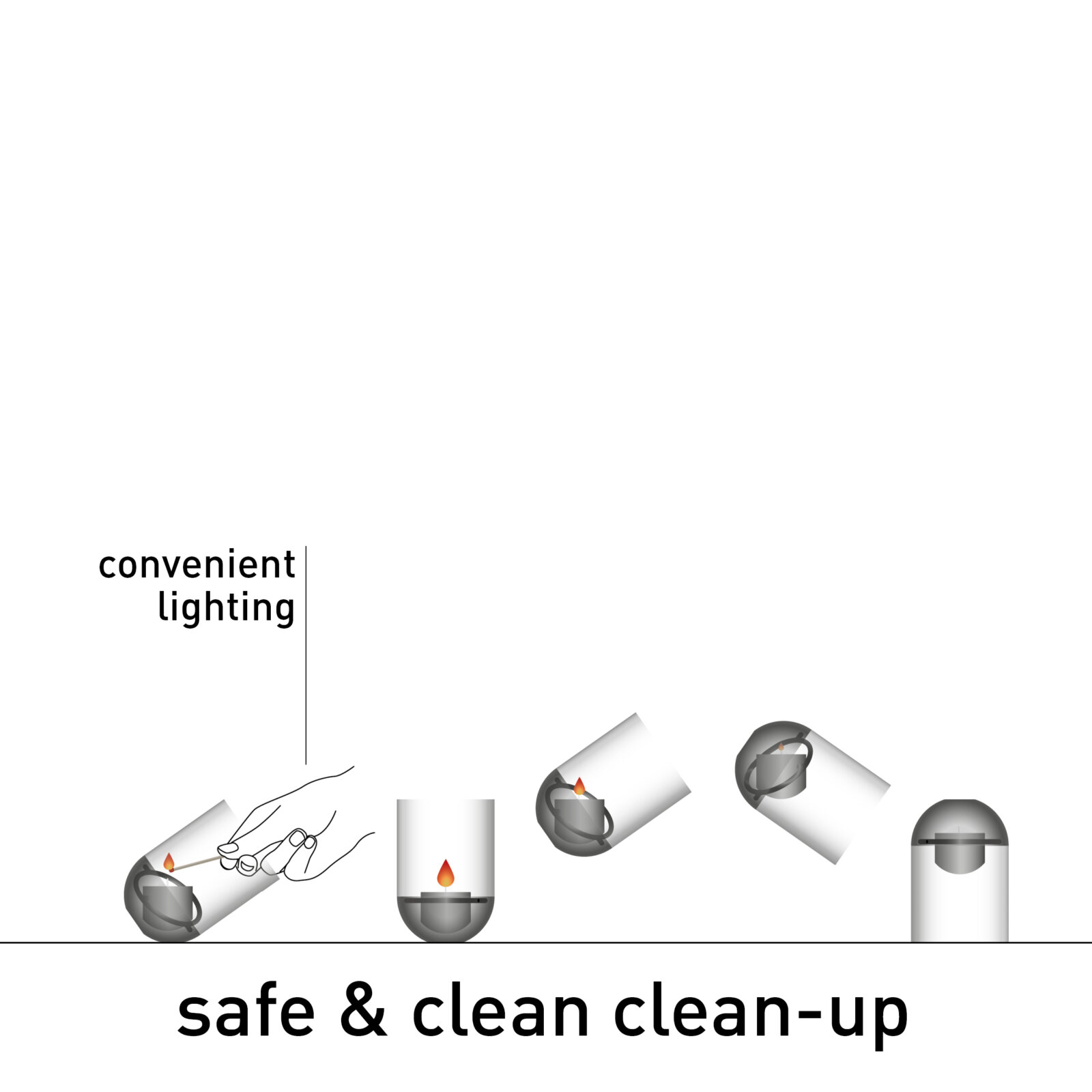 Az eloltáshoz csak fordítsa fejjel lefelé a GRAVITY mécsest. Nem kell eltávolítani az üvegcsét és nem kell aggódnia a csúnya viaszcseppek miatt. A gyertya gyors eloltásához csak fejjel lefelé kell fordítani: az alaptalp ekkor elfedi a lángot, megszakítja az oxigénellátást és kialszik. Nem kell kifújni, nincs viasz vagy füst! Praktikus: fejjel lefelé fordítva a lámpa belseje védve van a szennyeződésektől, esőtől és portól.