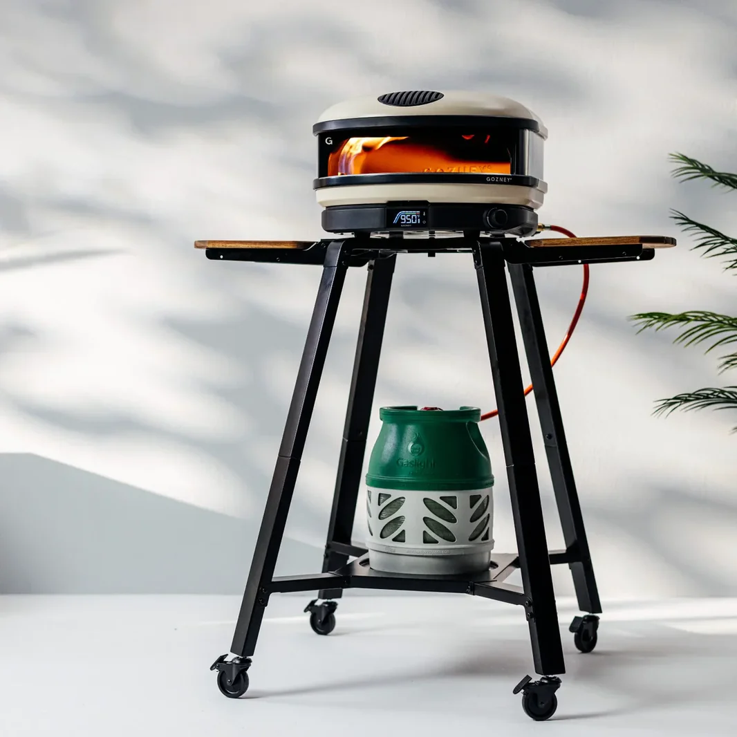 A Gozney mobil kemencében való főzést szem előtt tartva, a grillsütő / kemence biztonságosan csatlakozik az állványhoz egy könnyen elfordítható rögzítő segítségével, és a tökéletes magasságban áll a főzéshez.