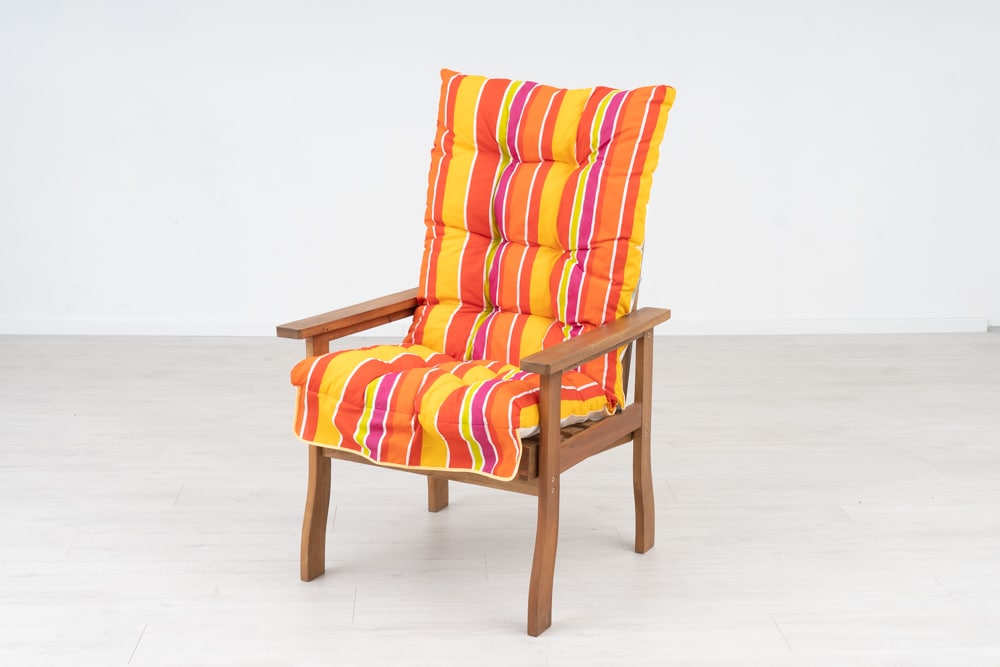 Kerti fa garnitúra, masszív kerti fotel és kerti pad 10 cm vastag párnákkal.