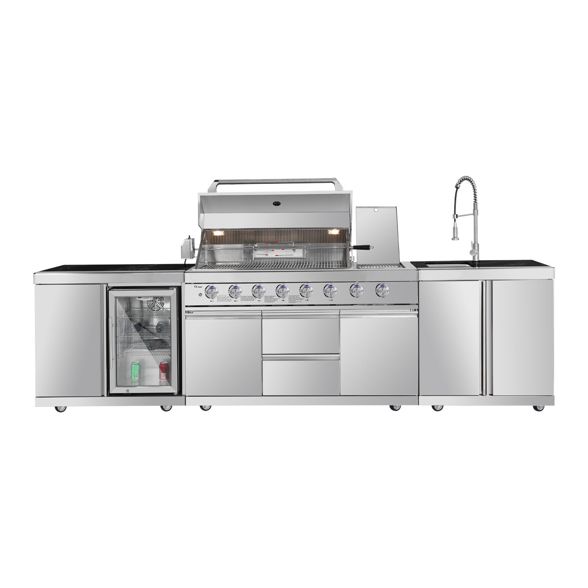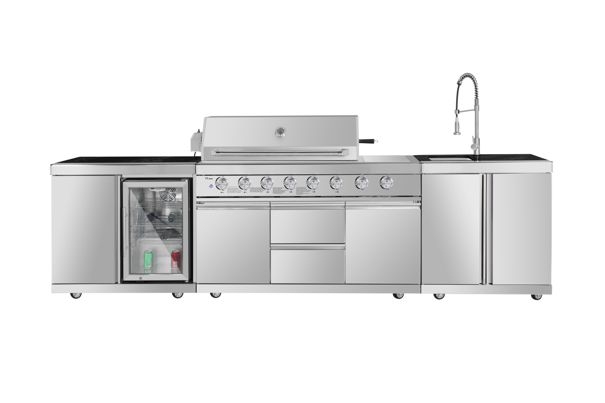 A Manhattan kombináció a kültéri konyhák csúcsát képviseli, három kulcsfontosságú elemmel: hűtős elem, grill egység és mosogatós elem. Teljes egészében rozsdamentes acélból készült, a fényes fekete, 2 cm vastag gránit fedlapokkal, melyek időtálló eleganciát és tartósságot kölcsönöznek ennek a konyhai összeállításnak. A moduláris kialakítás lehetővé teszi, hogy az elemek bárhogyan variálhatók és kombinálhatók a kültéri tér adottságaihoz igazítva.