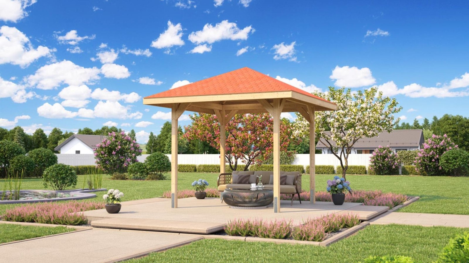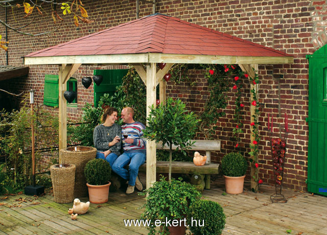 Négyszögletű kerti pavilon zsindely tetővel 294 x 294 cm.