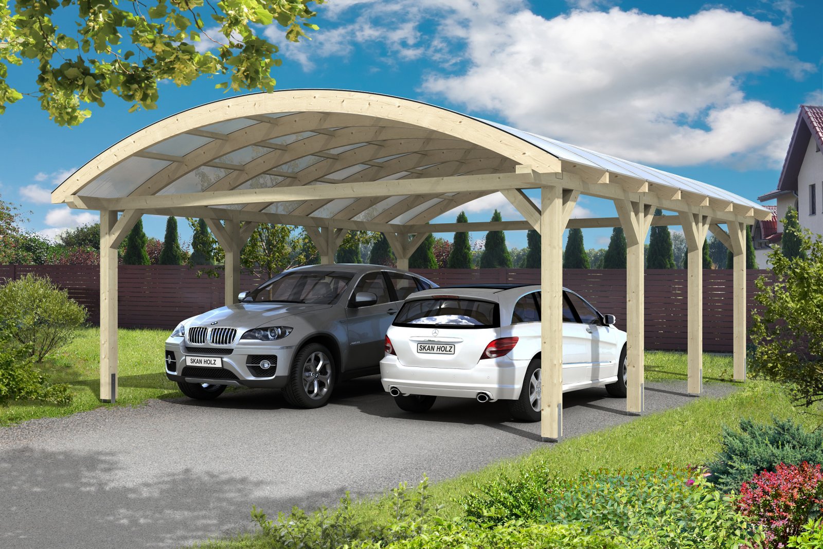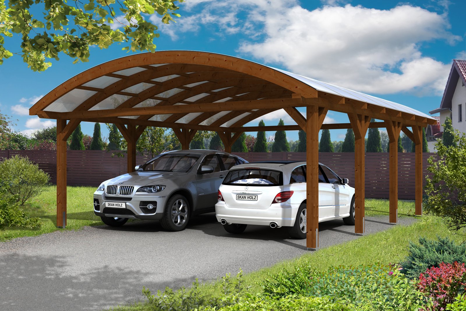Nyitott garázs Franken típus két autó részére, masszív 140 x 140 mm-es pillér alátámasztással épített elegáns íves garázstető szerkezet, ragasztott faanyagból, 4-gyári színben választható carport polikarbonát tetővel