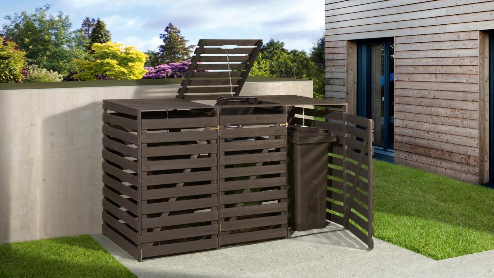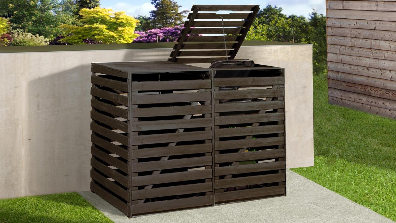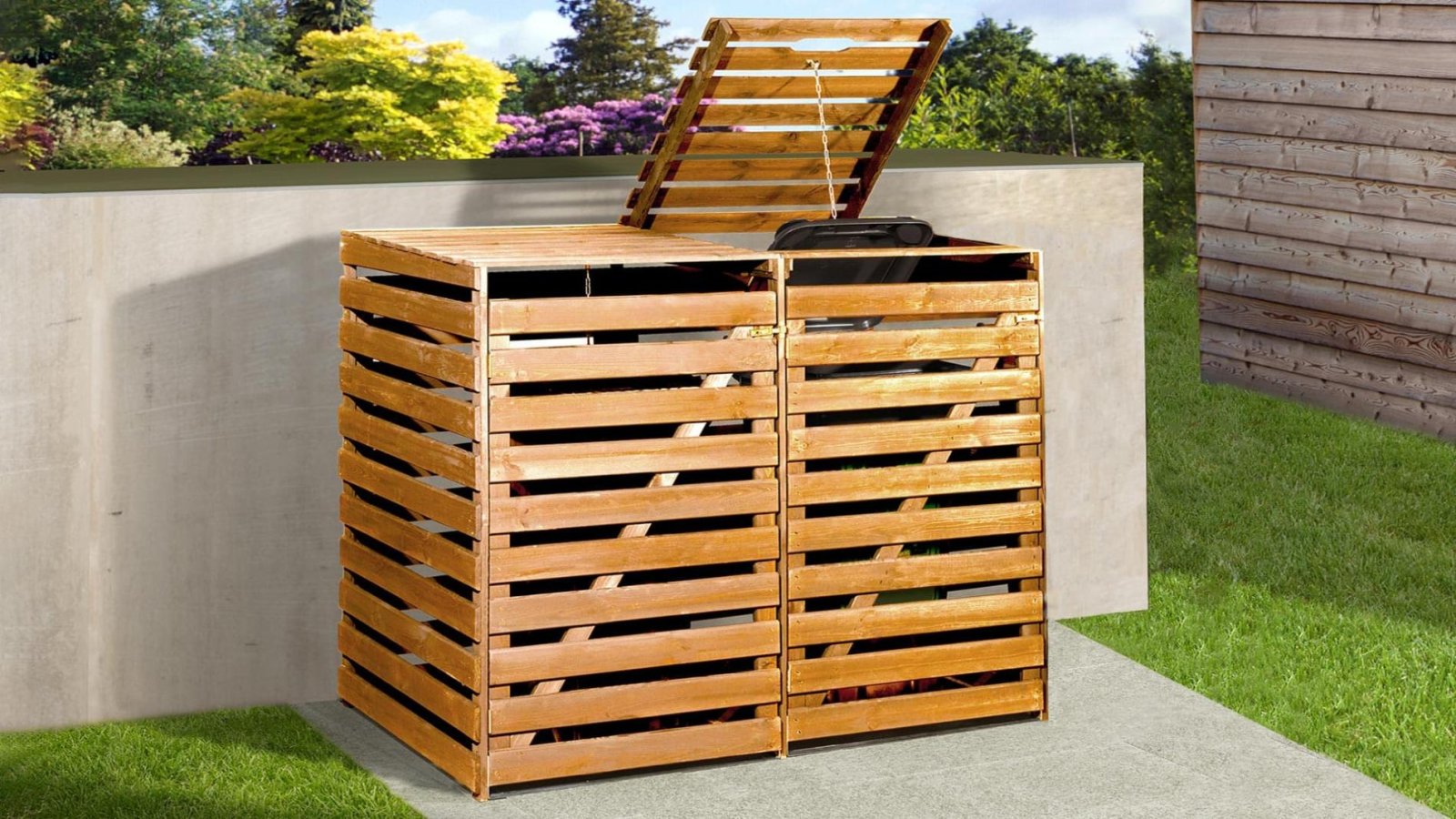 - Szemetesed jól elfér az udvari bejárat mellett a praktikus és robusztus fából készült szemeteskuka tárolóban. Az ajtók megkönnyítik a kukák kiürítését – akár üresek, akár teliek. A csuklós fedél a töltést is megkönnyíti.