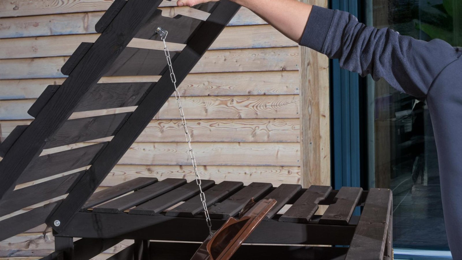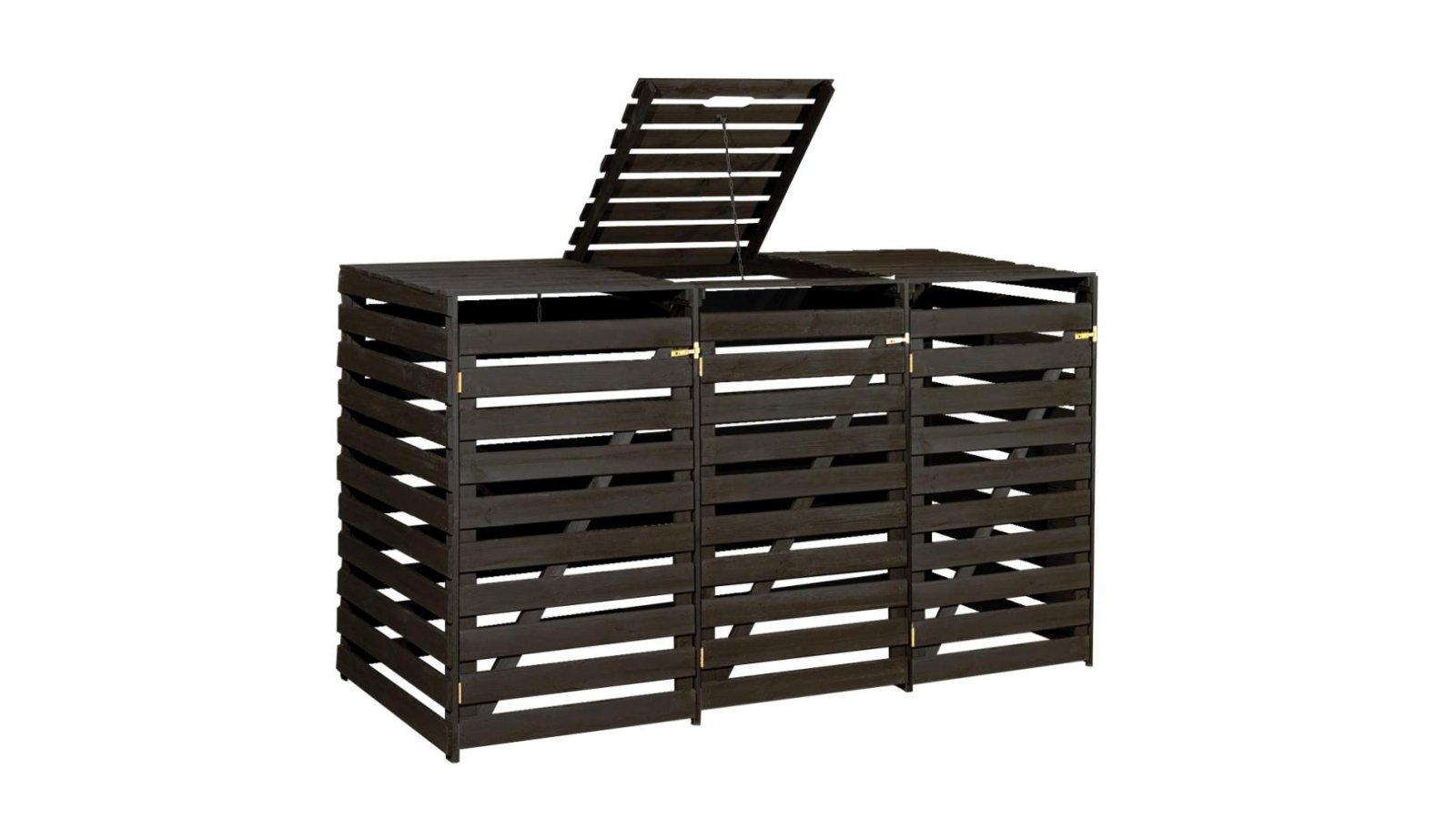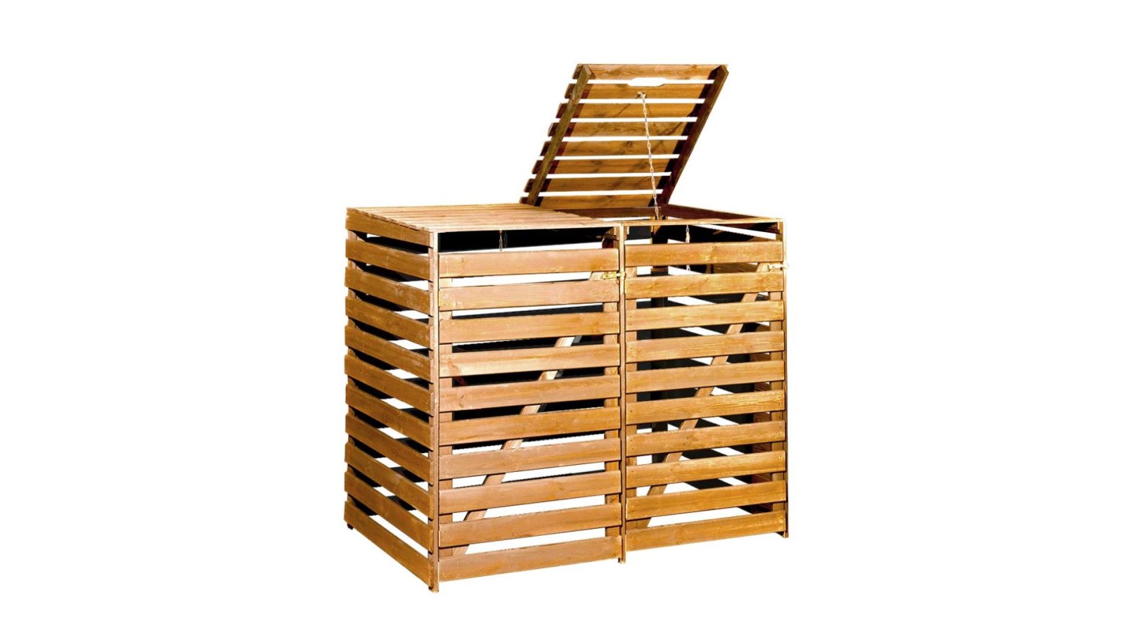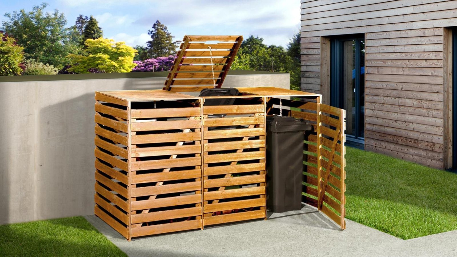 - Szemetesed jól elfér az udvari bejárat mellett a praktikus és robusztus fából készült szemeteskuka tárolóban. Az ajtók megkönnyítik a kukák kiürítését – akár üresek, akár teliek. A csuklós fedél a töltést is megkönnyíti.