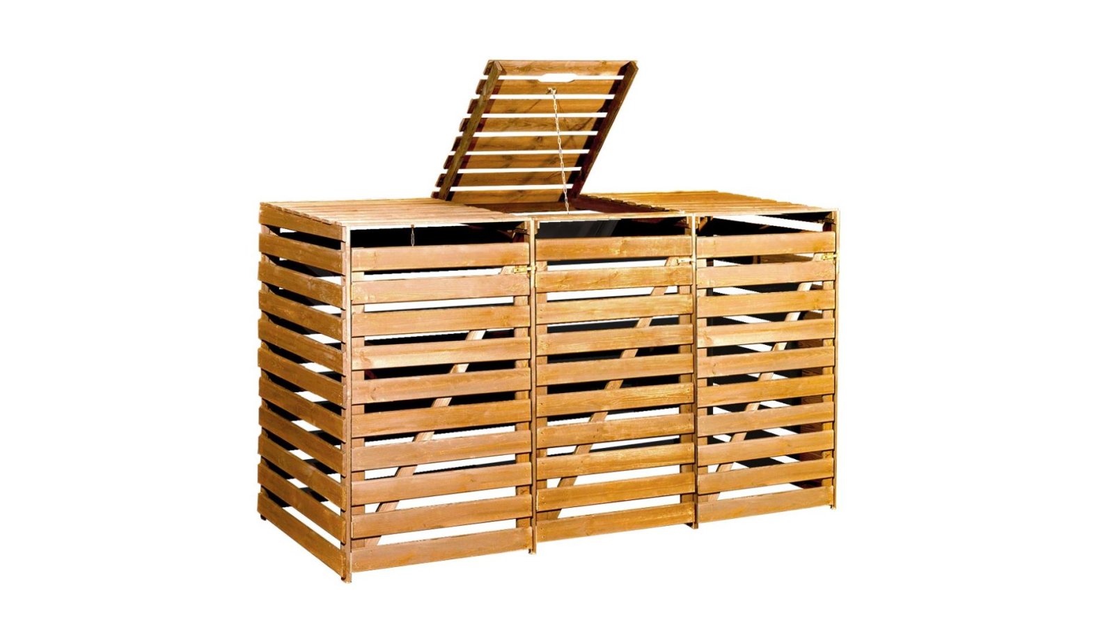 - Gyárilag előrefestett fa rácsozatú tároló 2 db 240 literes vagy 3 db 240 literes szemeteskuka tárolására alkalmas