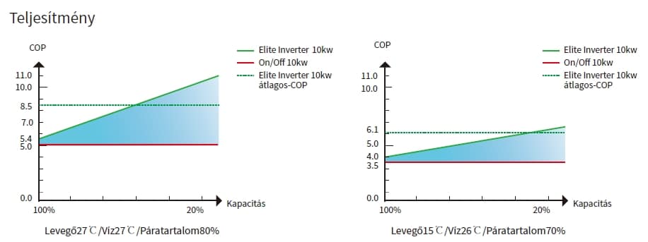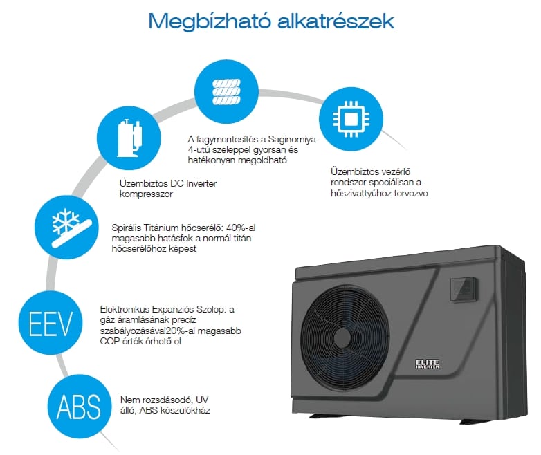 Az inverterrendszer optimális beállításával a hűtőközeg (gáz) áramlási sebességének szabályozására kevesebb áramot fogyaszt. Az Elite Inverter precíz hőmérséklet-szabályozással rendelkezik. Amikor a medence hőmérséklete közelít a beállított értékhez, alacsonyabb sebességre vált a hőszivattyú, ami nagyobb hatékonyságot (C.O.P) és csendesebb működést biztosít.