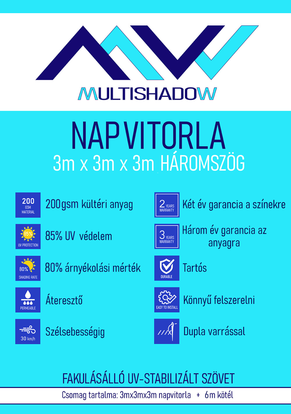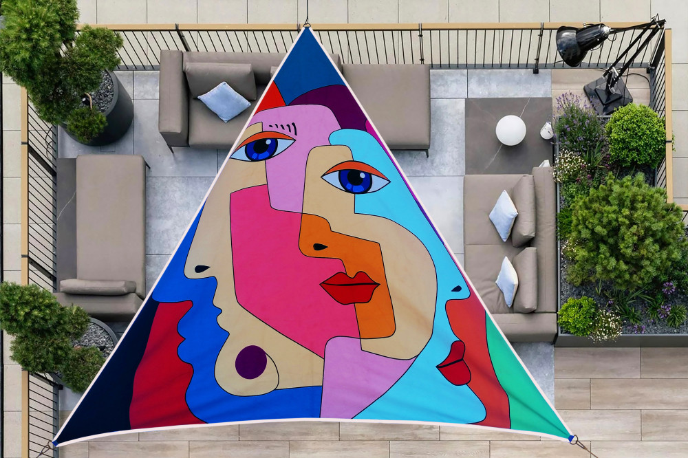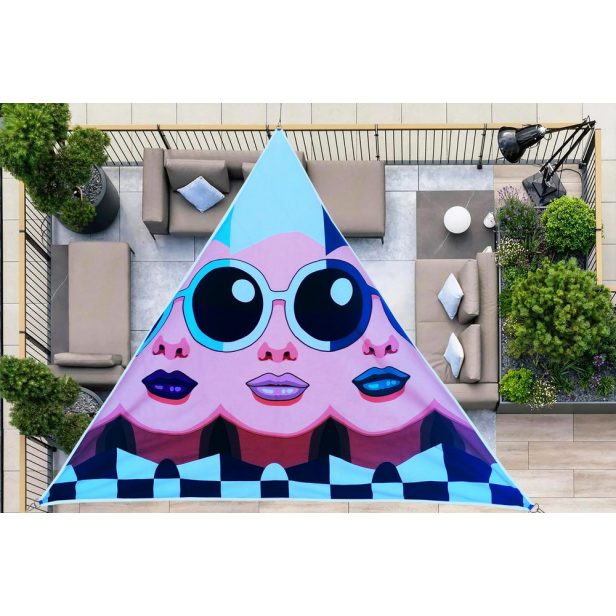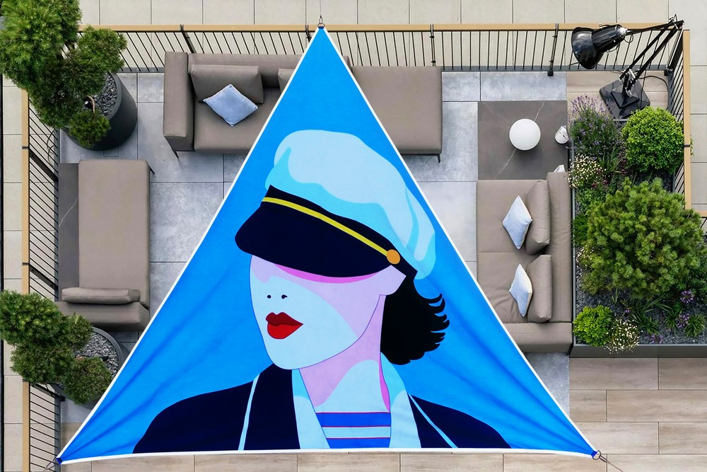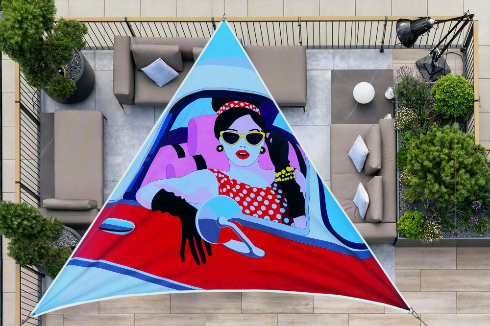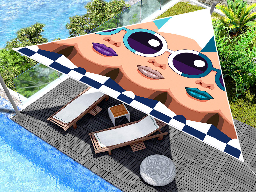 - Tartozék 6m nagy teherbírású kötél melyet az adott helyszínhez igazodva méretre lehet vágni.Dizájner napvitorla 3m-es egyenlő oldalú háromszög alakban, digitális kétoldalas nyomtatással, prémium anyagra.Modern dizájn, három fiatal női arc színes rúzzsal és napszemüveggel. Fehér, kék színek. A minta minkét oldalról egyenértékűen látható, a napvitorla felszerelése a D gyűrűkkel és a tartozék kötéllel néhány percet vesz igénybe.A napvitorla árnyékol, blokkolja a káros UV sugarakat és csökkenti az árnyékolt terület hőmérsékletét, miközben hangulatossá teszi a környezetet.