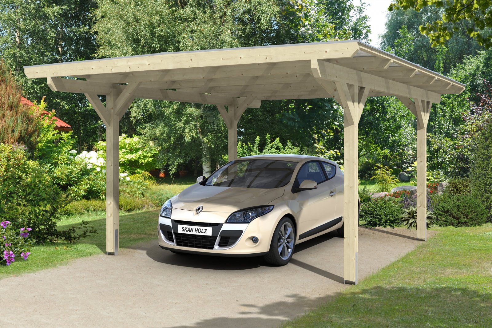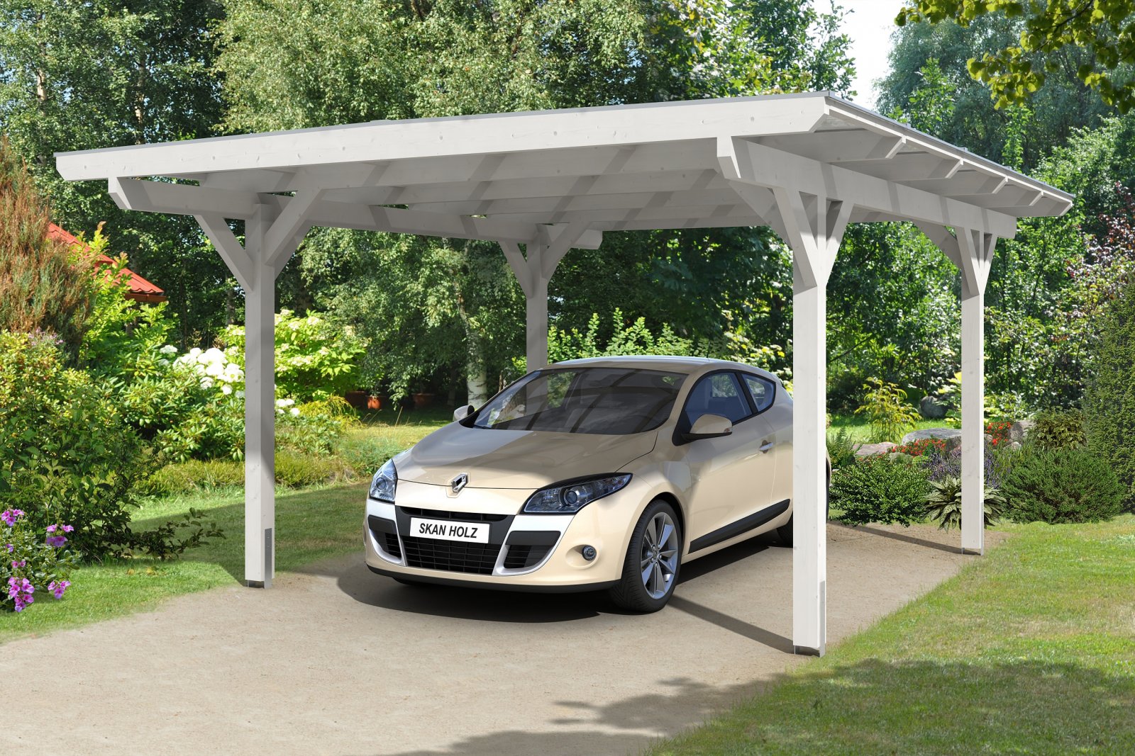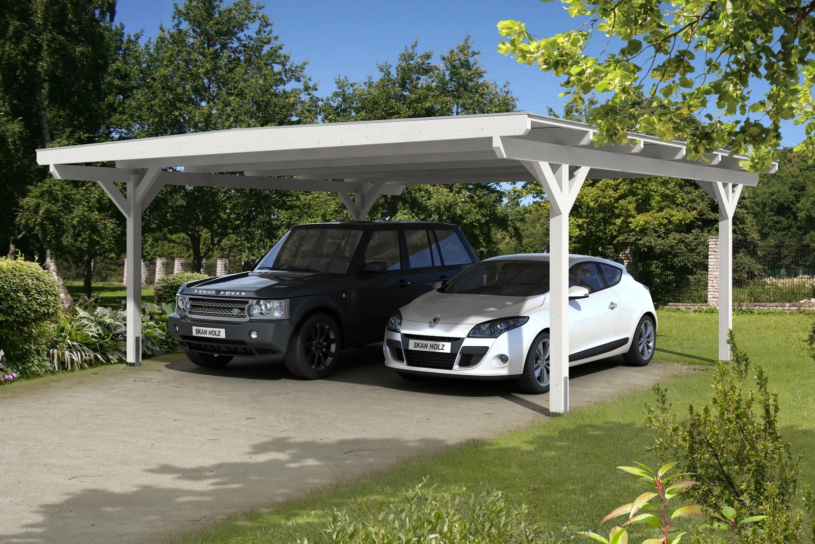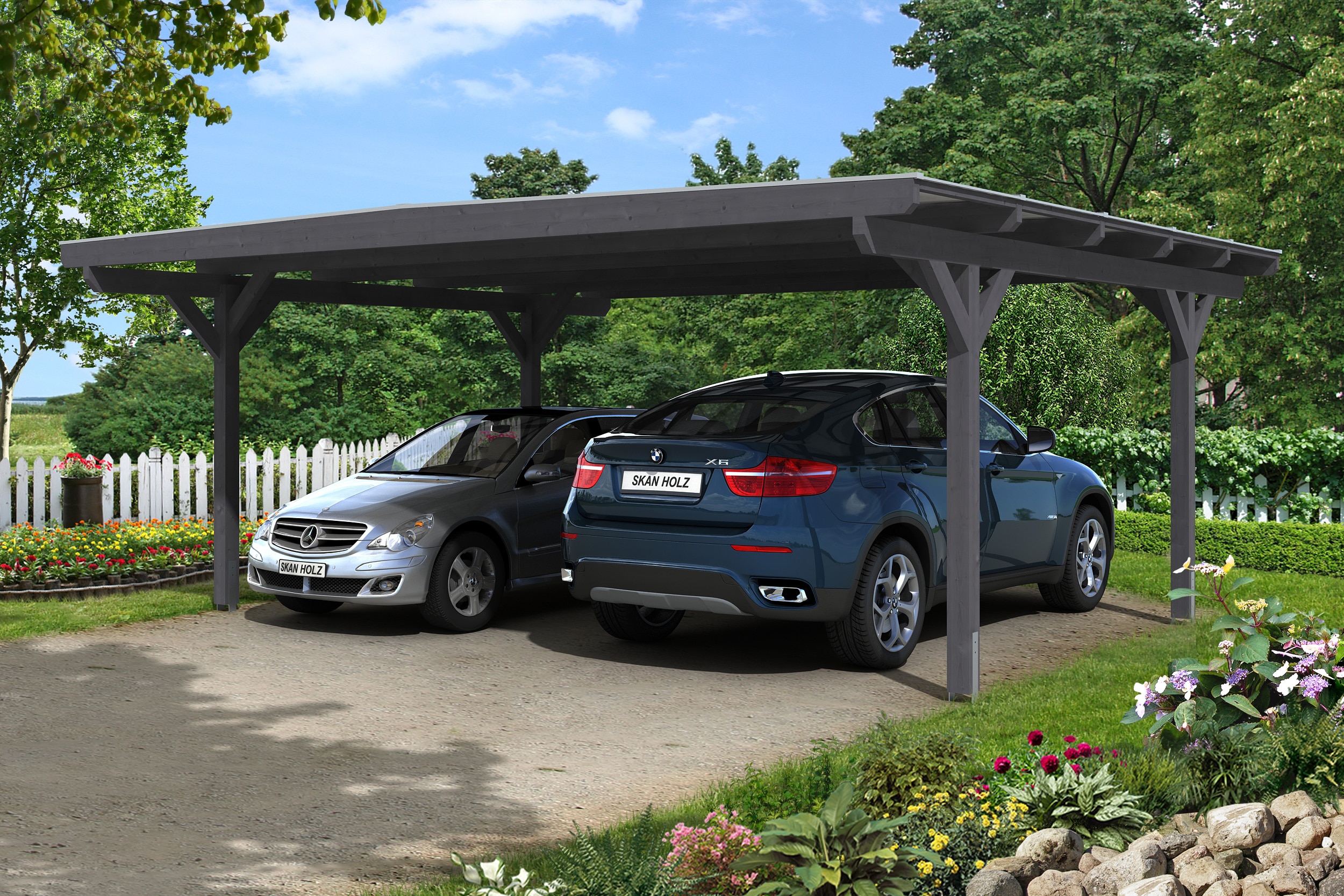 Nyitott garázs 4-választható méretben Odenwald típus 2 autó részére, helytakarékos 4 db pillér alátámasztással épített elegáns garázstető szerkezet, ragasztott faanyagból. 4-méretben 4-gyári színben választható carport polikarbonát tetővel