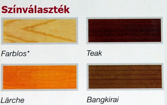 - Hőkezelt faanyagok, pl. teak, bangkirai, massaranduba, iroko, tölgy, vörös- és duglászfenyő felületvédelmére