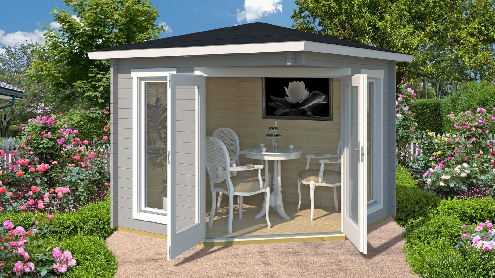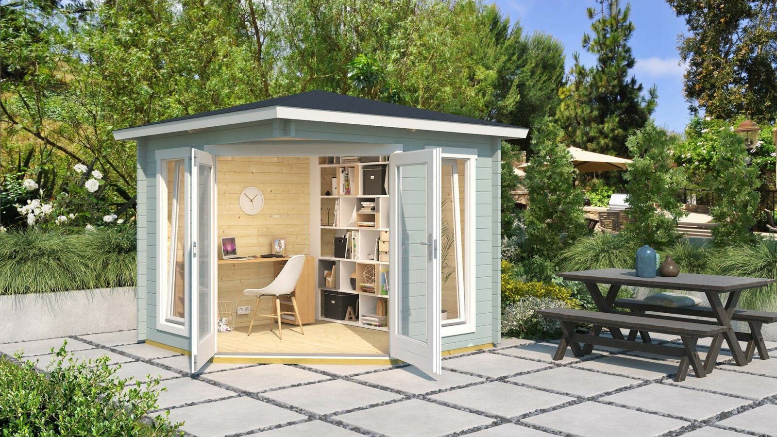 Ötszögletű praktikus helytakarékos Weka_408 pavilon faház nagy ablakokkal, padlózattal együtt.
