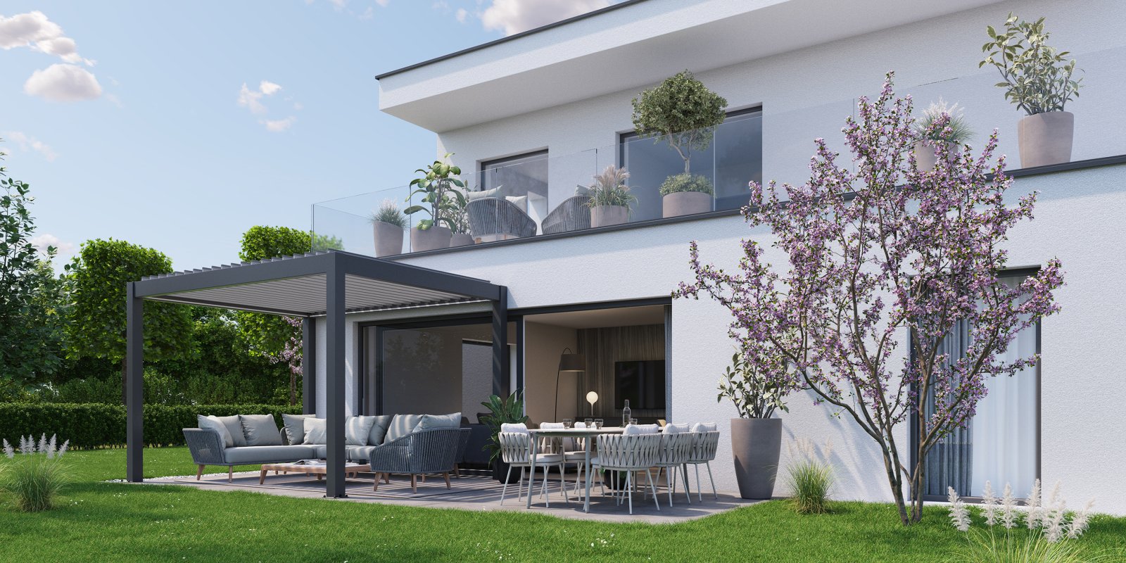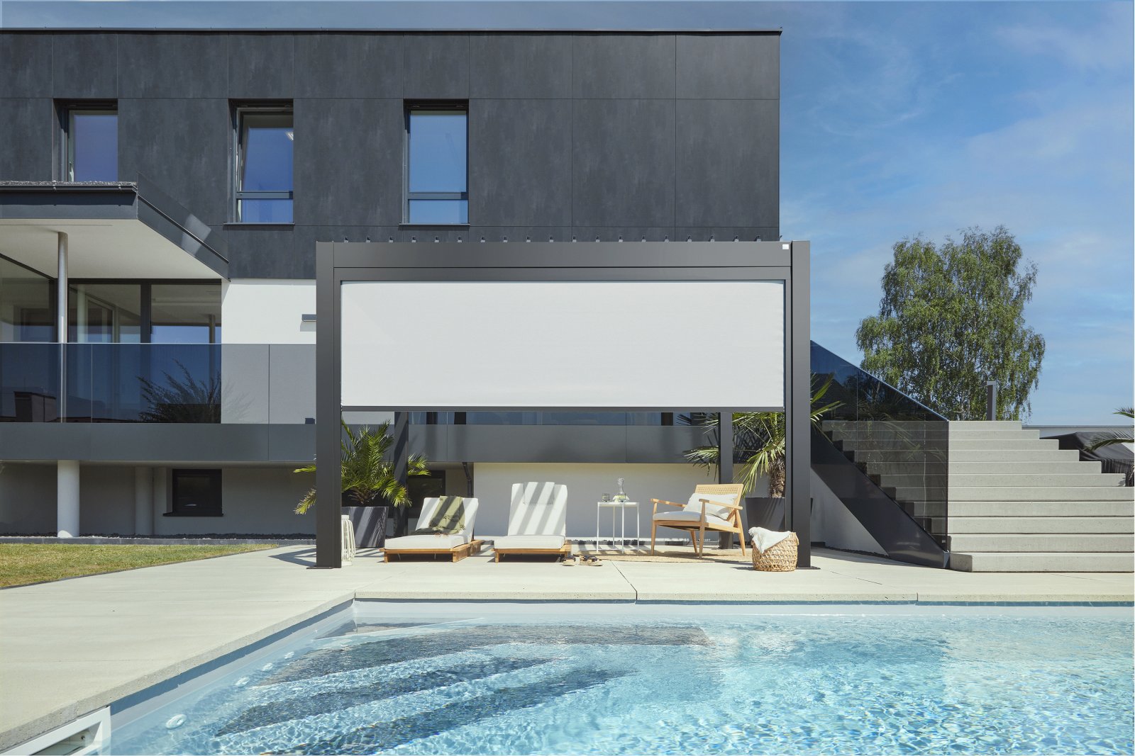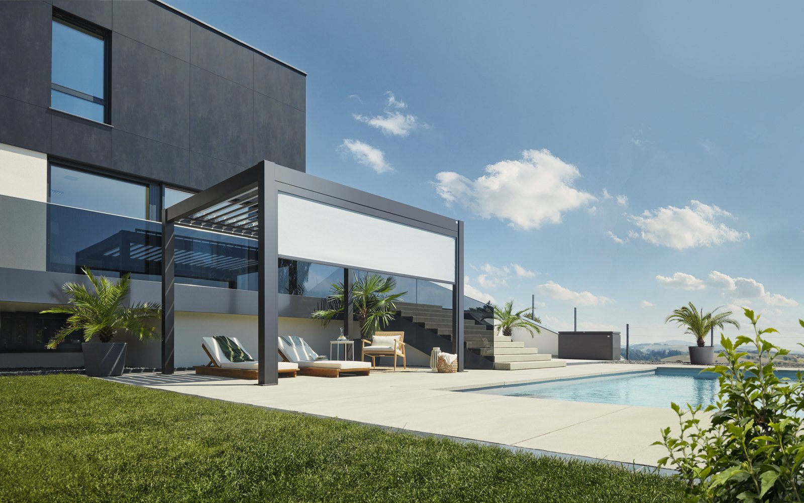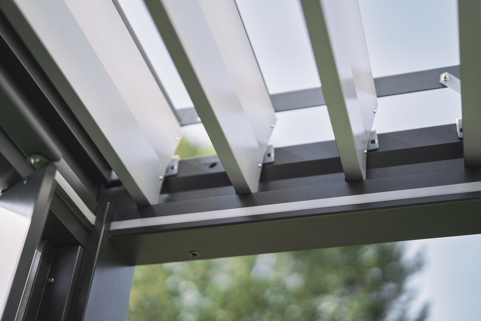 - Biohort fém pergola építés szigetelt tető lamellákkal