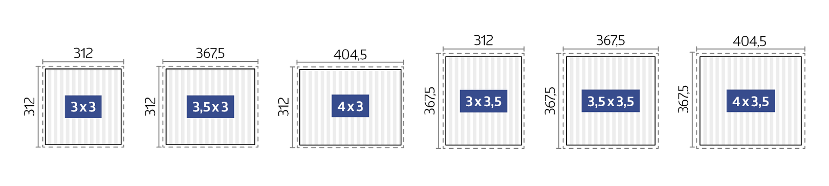 | Pergola méret | 312 x 312 cm, 312 x 367,5 cm, 312 x 404,5 cm, 367,5 x 312 cm, 367,5 x 367,5 cm, 367,5 x 404,5 cm |