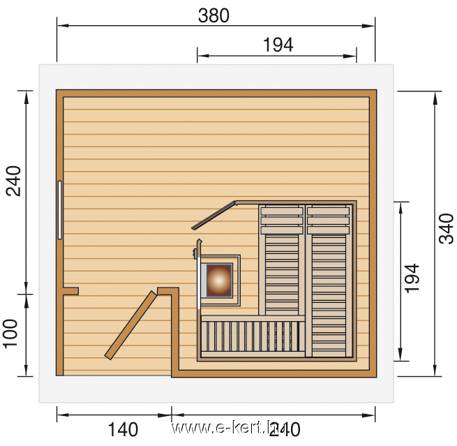 - Szaunaház külső sarokmérete (alapozási mérete ) 380 x 340 cm