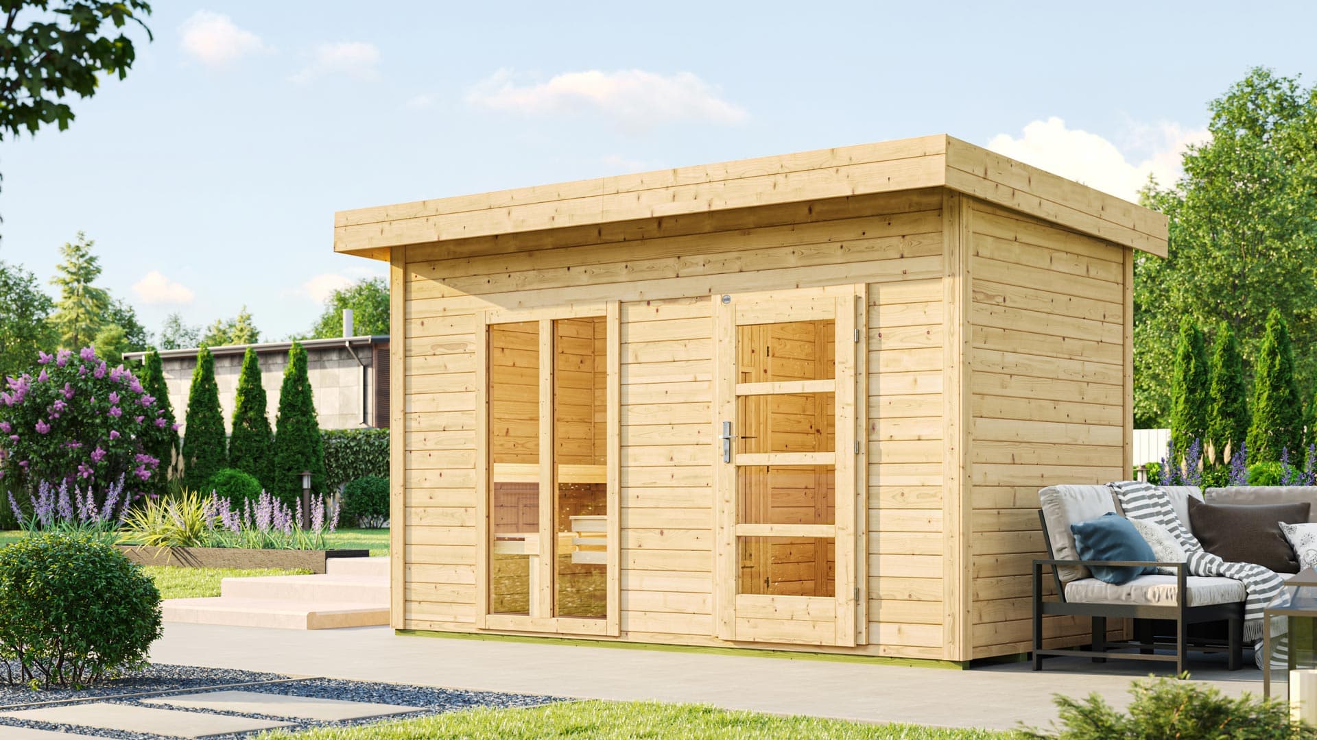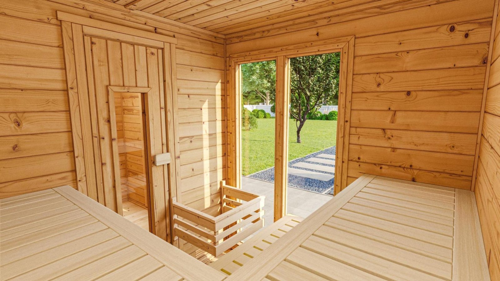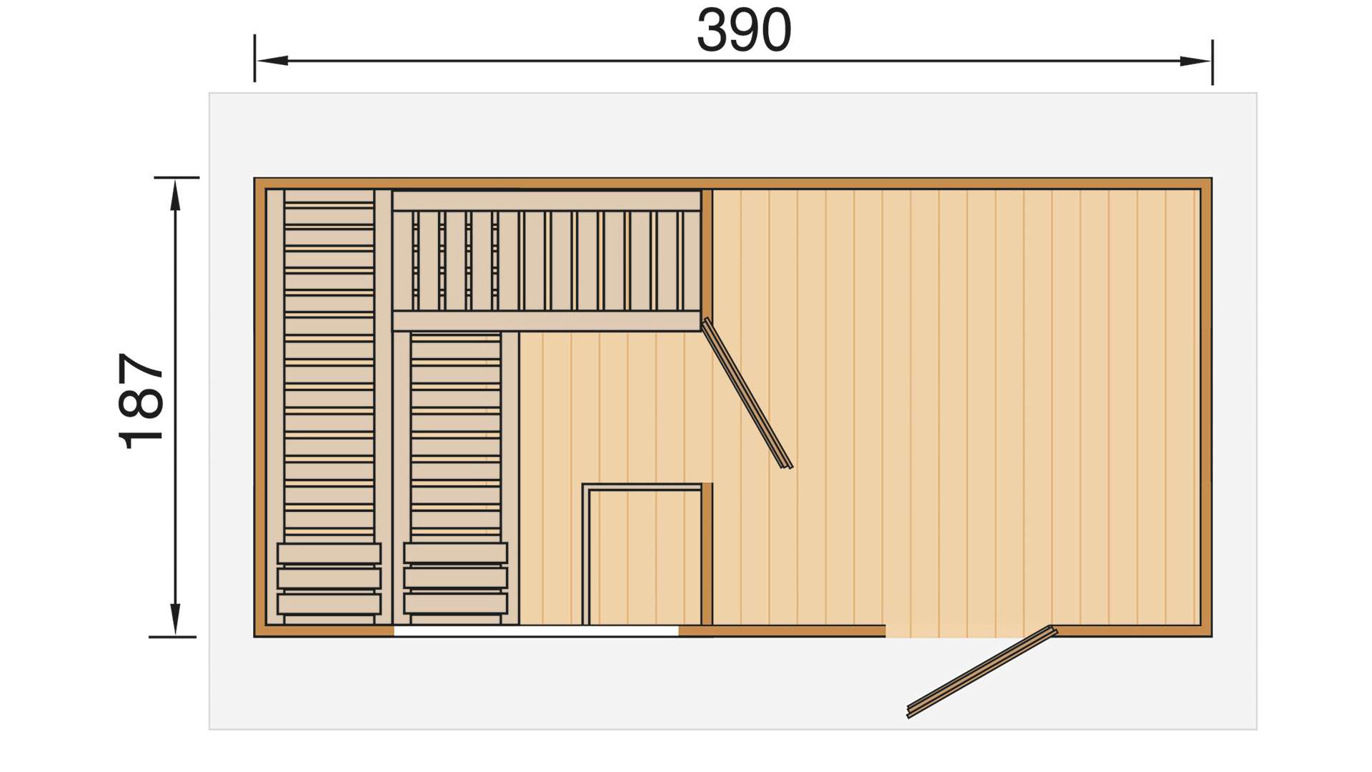 - A 390 x 187 cm-es szaunaházban kerül felépítésre egy 179 x 190 cm belső méretű finn szauna