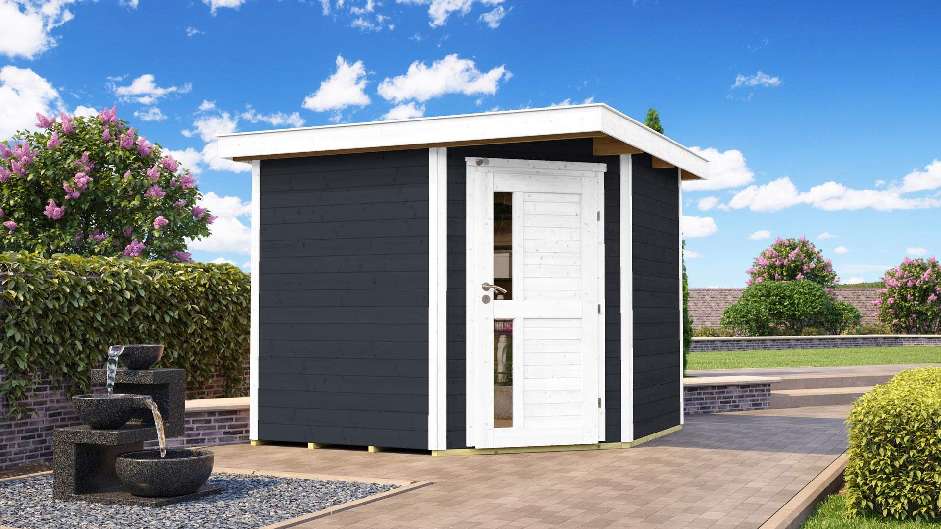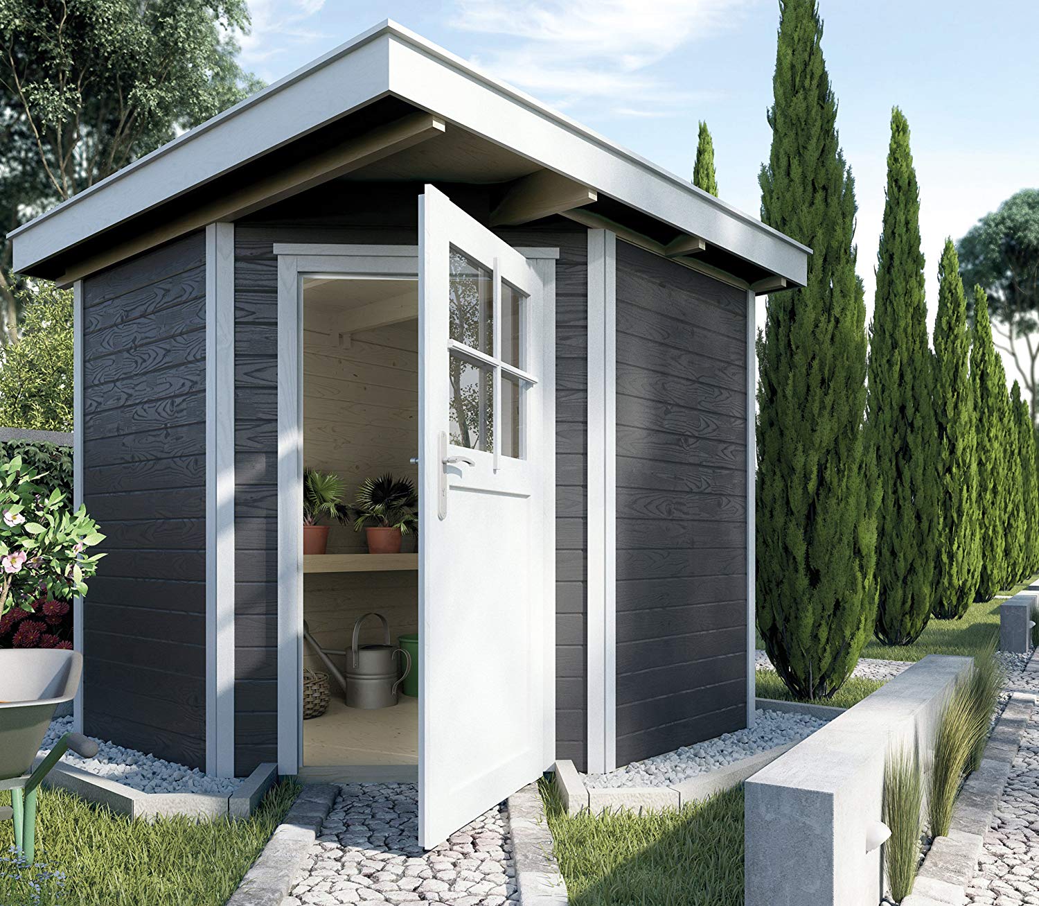 Helytakarékos 5-szögletű lapostetős Weka szerszámtároló faház.