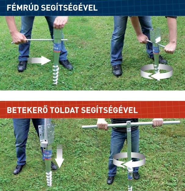 - betonozás nélkül talajcsavarokkal (csak földes – nem betonozott, nem sziklás – megtermett föld felület esetén )