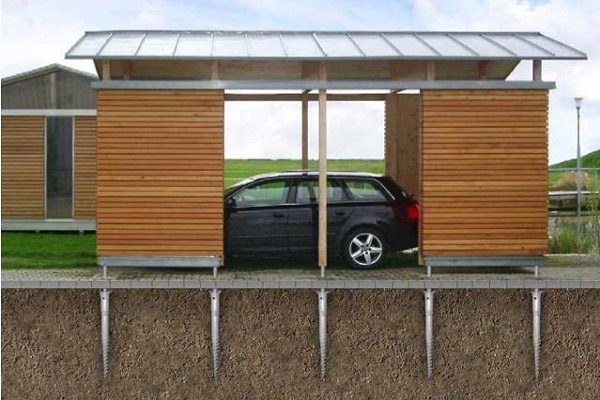 Talajcsavarok alkalmazásával a kerti felépítmények alapozása, betonozása elkerülhető, a kivitelezés gyorsabb és tisztább.