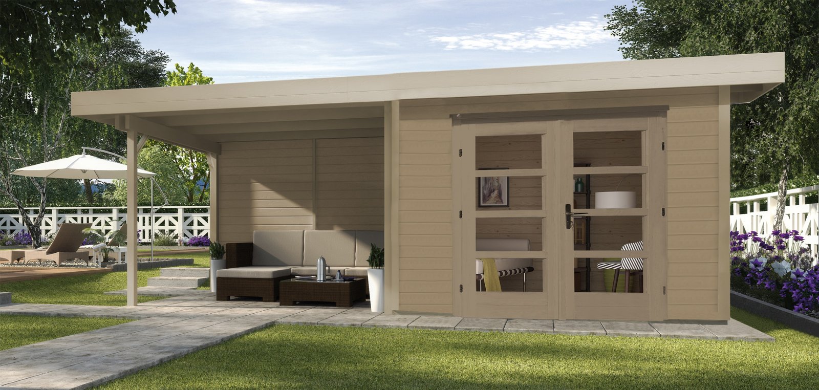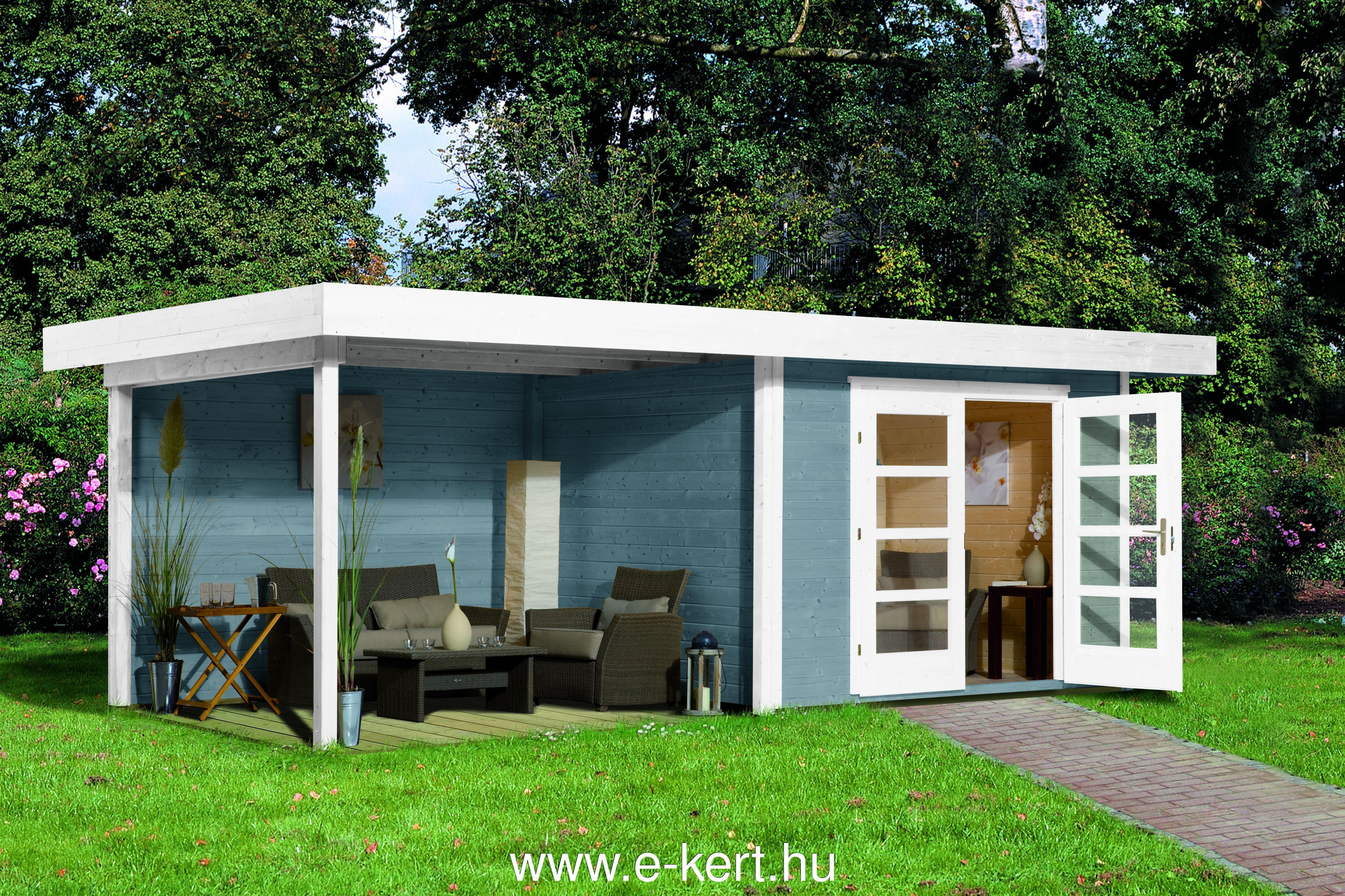 Weka chillout kerti ház modern, minimalista lapostetős faház kivitel. Természetesen a tető hátrafelé lejt, azonban az oromdeszkák miatt optikailag vízszintesnek látszik a tetőszerkezet.