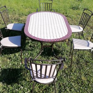 Acélvázas kerti bútor garnitúra rakásolható székekkel. Mozaiklapos kerti asztal 90 x 160 cm + 2db karfás szék párnával + db karfa nélküli fém szék párnával